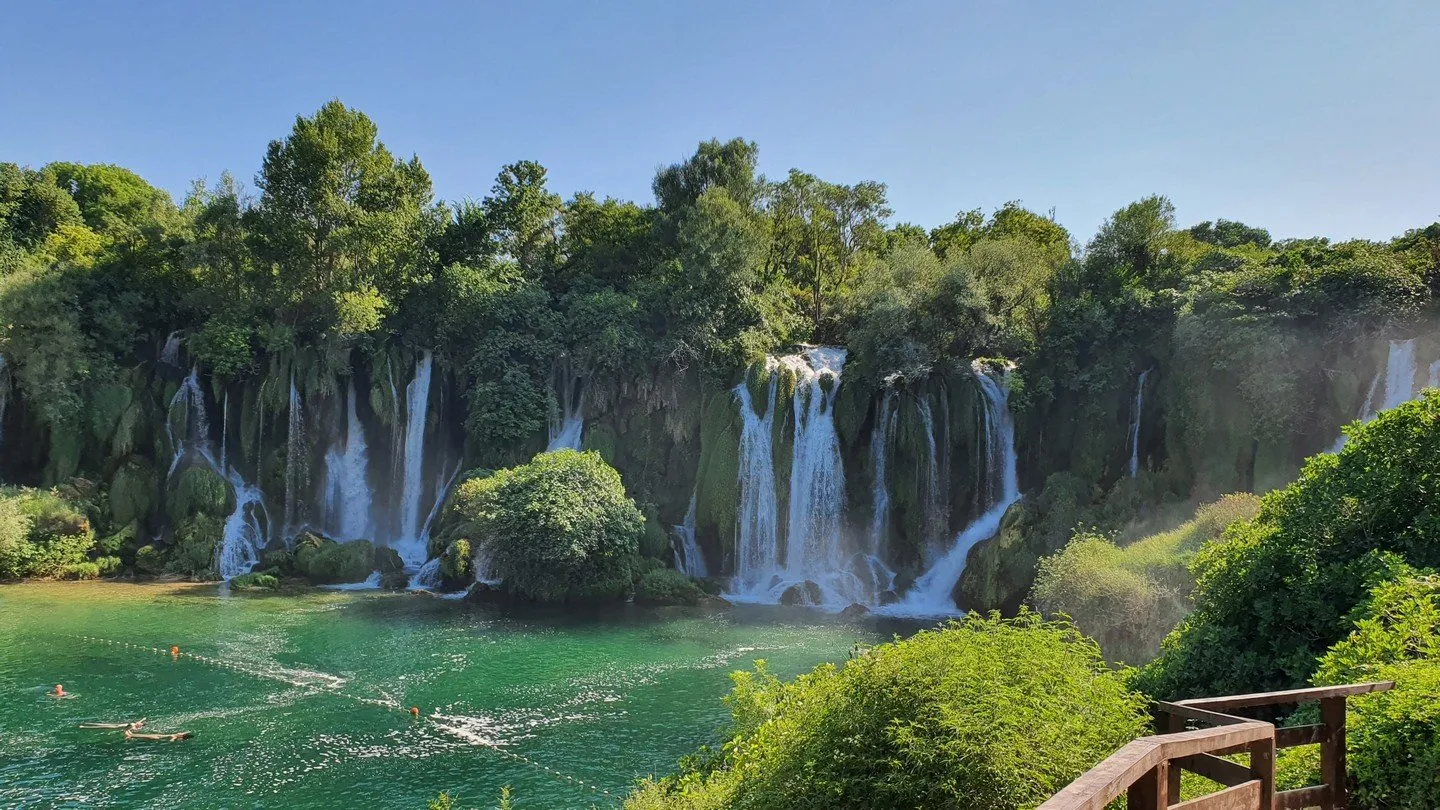 Ze Stonu jsme se po novém mostě Pelješac přes Malostonský záliv dostali opět do Bosny. Jde o zavěšený most dlouhý 2,4 km, který propojuje dvě územně nesouvislé části Chorvatska rozdělené sedmikilometrovým koridorem Bosny a Hercegoviny. Naším cílem byly 77 km vzdálené vodopády Kravica. Před vstupem k vodopádům je rozlehlé parkoviště, kde je dostatek místa, i když podle počtu aut bylo jasné, že jde o oblíbené místo pro turisty i místní. K vodopádům musíte projít přes hlavní budovu, kde zakoupíte vstupenky ve výši 10 €/os (děti zdarma) a pak se lze dolů k vodopádům dostat buď pěšky, což znamená seskákat pár schodů - nic strašného pokud nemáte vyvrknutý kotník - a nebo vláčkem, který jezdí každých 20 min.