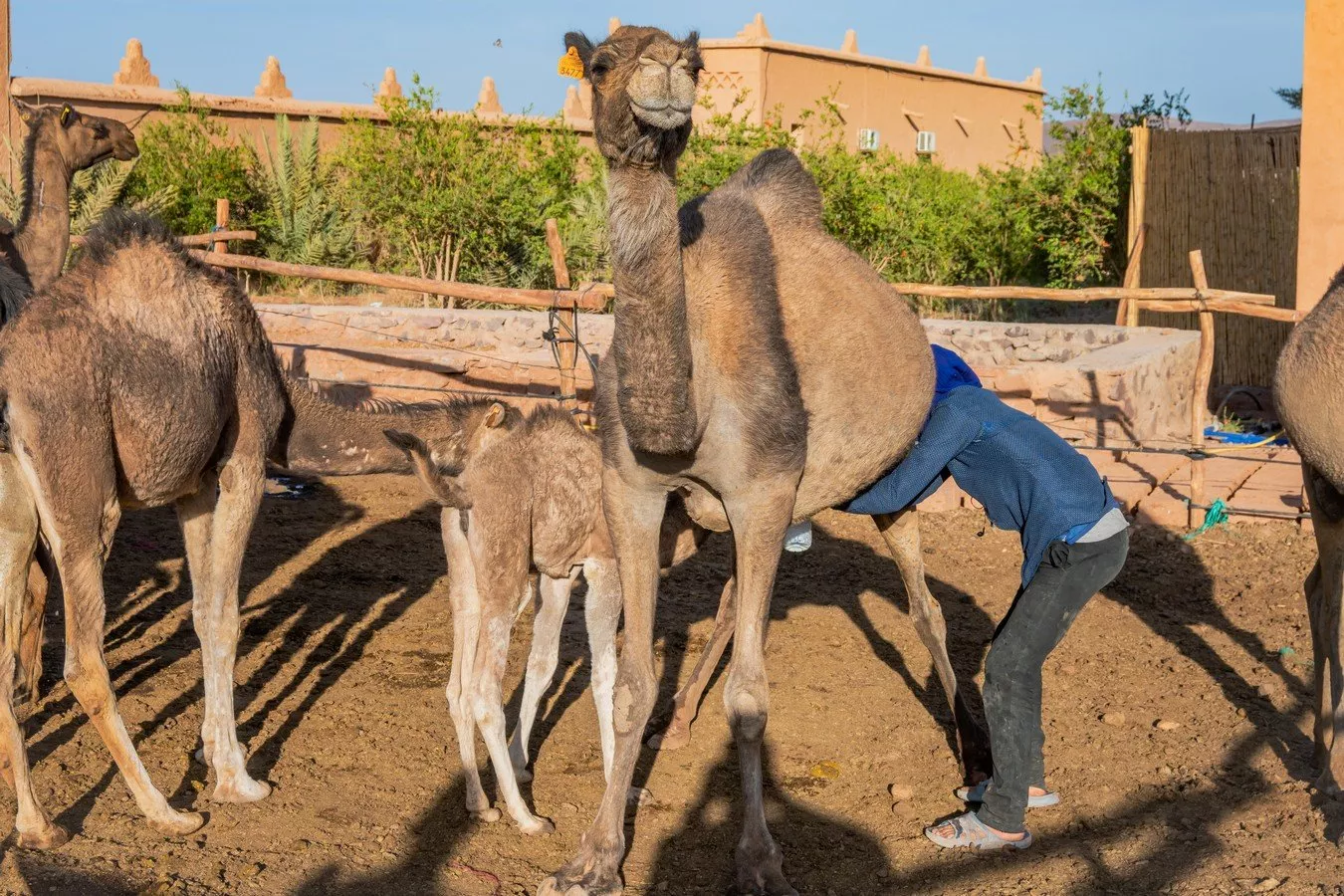 Sledovali jsme ho, jak přistoupil k mohutné velbloudici, pohladil ji a začal ji dojít. Vše se dělo s jakousi dávnou důstojností – jako rituál, který tu probíhá stovky let. Pak uřízl starou pet lahev a přelil do ní bílý, lehce pěnivý nápoj. Nabídl nám čerstvě nadojené velbloudí mléko.