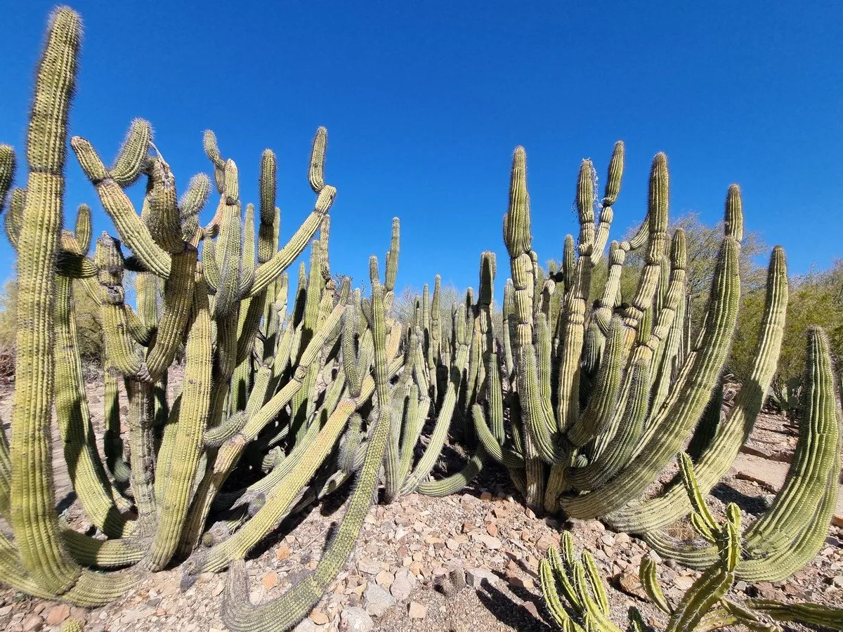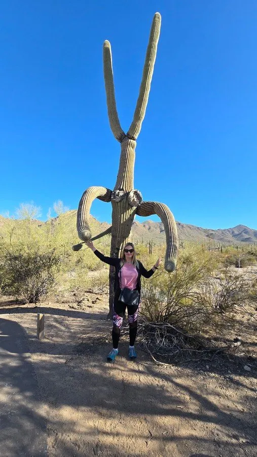 Jdeme krátký okruh okolo návštěvnického centra, kde nás hned na začátku vítá obrovský kaktus, který má ramena skloněna tak, jako by nás chtěl obejmout. Nevím, jestli mu k tomu růstu nějak pomohli, anebo zda tak vyrostl přirozeně, každopádně se jedná o zajímavou záležitost. Čím dále po stezce jdeme, tím více začínám získávat pocit, že nejsem v poušti, ale v spíše v botanické zahradě. V Národním parku Saguaro nerostou jenom stejnojmenné kaktusy. Je to komplex rostlin různých druhů, skal a další všemožné pouštní vegetace, která je dokonale roztroušena v krajině a tvoří jedinečný celek. Procházíme se v něčem tak nádherném, až se mi tají dech.