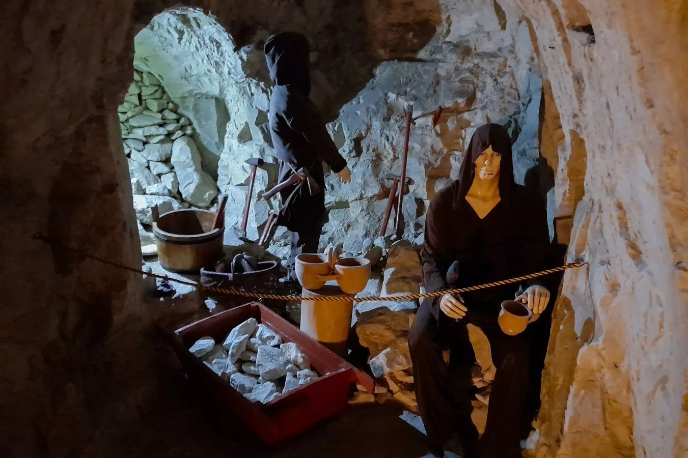 Během prohlídky jsme sestoupili po dlouhém, mírně se točícím schodišti přibližně šedesáti schodů až do hloubky třinácti metrů pod povrch města. Tam dole, v chladném podzemí, kde i v létě teplota nepřesahuje 9 °C, nás obklopilo ticho, které rušily jen tlumené kroky skupiny a občasné kapky stékající ze stropu. Průvodce – charismatický muž s hlubokým hlasem a hereckým nadáním – nás vedl spletitými chodbami vysekanými přímo v bílé křídě. Stěny byly drsné a pokryté stopami po ruční těžbě – rýhy, záseky, někde i podpisy dávných dělníků.