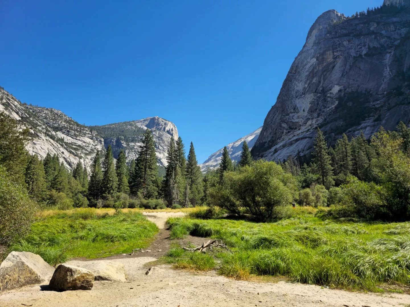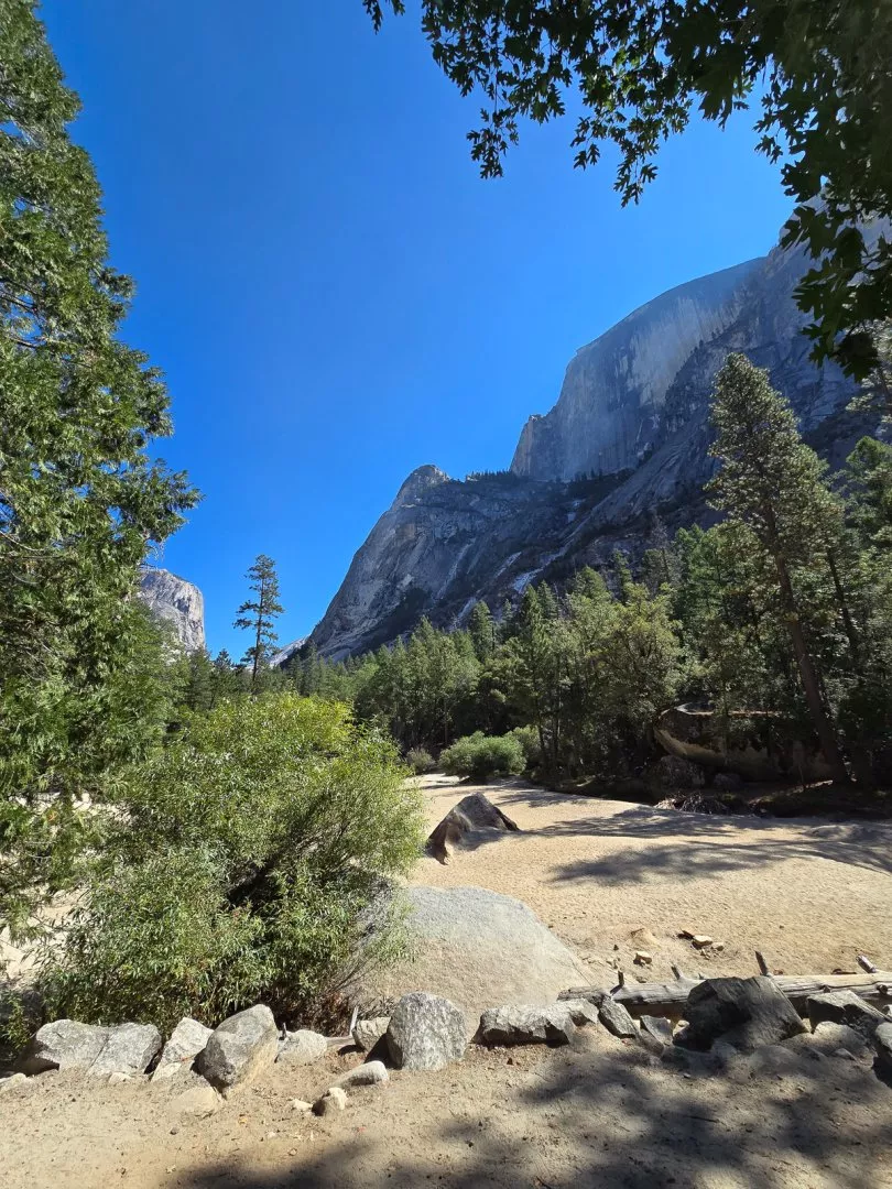 Ačkoliv jsme pořád velmi blízko hlavního návštěvnického centra, na stezce lidí moc nepotkáváme. Cíl naší vycházky, jezero Mirror Lake, je v tuto roční dobu zelenou horskou loukou. Voda je zde jen na jaře. Místo toho tedy pozorujeme dominantu Yosemit, skálu Half Dome, která s občasným jezerem přímo sousedí. Na Half Dome lze z druhé strany vylézt stezkou, která vede po příkré skalní stěně. Ve skále jsou sloupky spojené ocelovými lany, která umožňují turistům výstup nahoru.