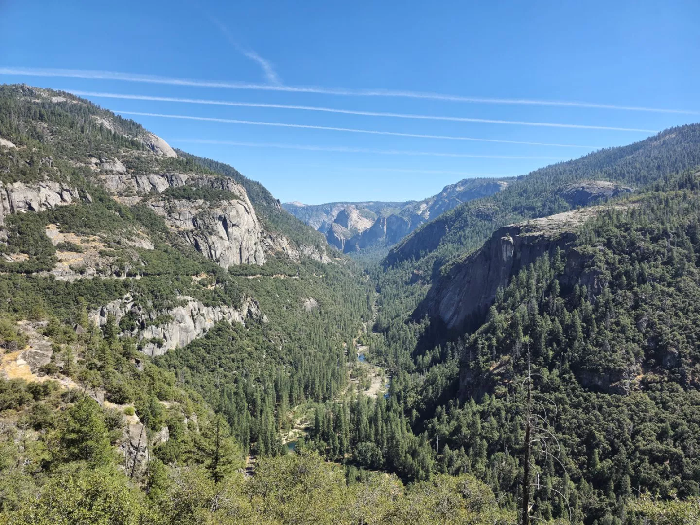 Přijíždíme k prvnímu ikonickému výhledu na Yosemitské údolí, které skutečně vypadá jako z katalogu. Yosemite Valley, jak se anglicky údolí nazývá, je dvanáct kilometrů dlouhé a obklopují ho skalní stěny, které mohou mít výšku i přes tisíc metrů. Údolí zabírá jen procento z celé rozlohy národního parku. Většina z více než tří miliónu návštěvníků, kteří park ročně navštíví, míří právě sem.