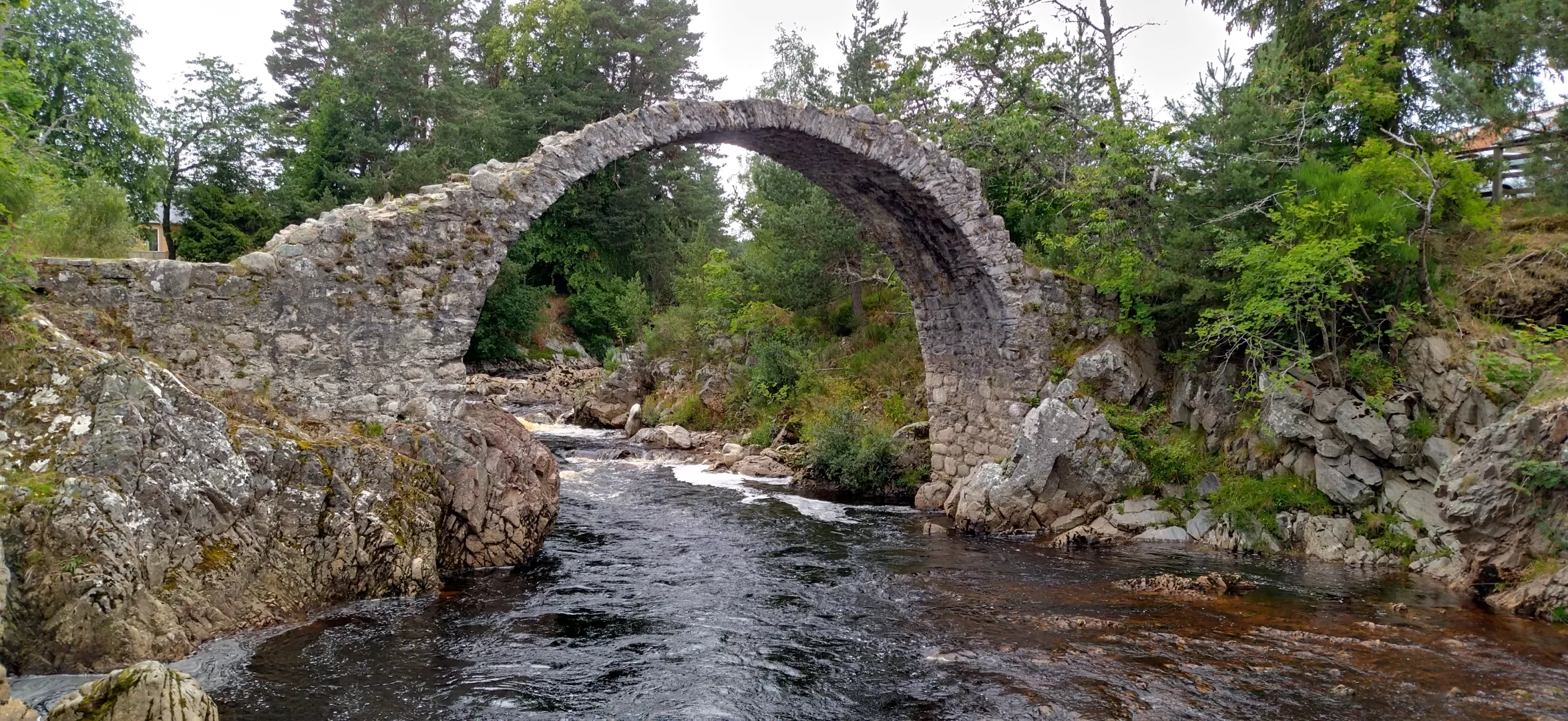 V úterý jsme měli v plánu navštívit destilérku Glenfiddich. Bohužel mají pondělky a úterky zavřeno, což jsme nevěděli. Nakonec jsme se prošli areálem, který je sám o sobě moc hezký, a vyrazili do města. Cestou jsme viděli první skotské krávy. Bylo tam otevřené snad jediné bistro, ale dalo se tam dobře naobědvat. Pokračovali jsme do Carrbridge. Je zde nejstarší kamenný most na Skotské vysočině. Holky se vyběhaly na úžasném hřišti, které bylo hned vedle parkoviště, kde jsme stáli.