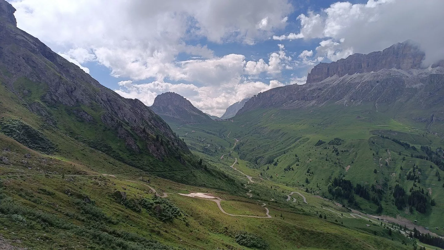 V úrovni vrchní stanice lanovky Carpazza cesta trailu opouští širokou šotolku a stezka se začíná klikatit vedle ní, aby se zhruba po kilometru opět na šotolku vrátila. Otevírá se nám pohled na údolí vedoucí od městečka Arabba až na sedlo Pordoi (2250 m n. m.) a nad ním v mracích obrovský skalní masiv Piz Boe, pod kterým jsme u horské boudy Rifugio Bec de Roces zhruba před hodinou svačili a oknem se koukali naším směrem.