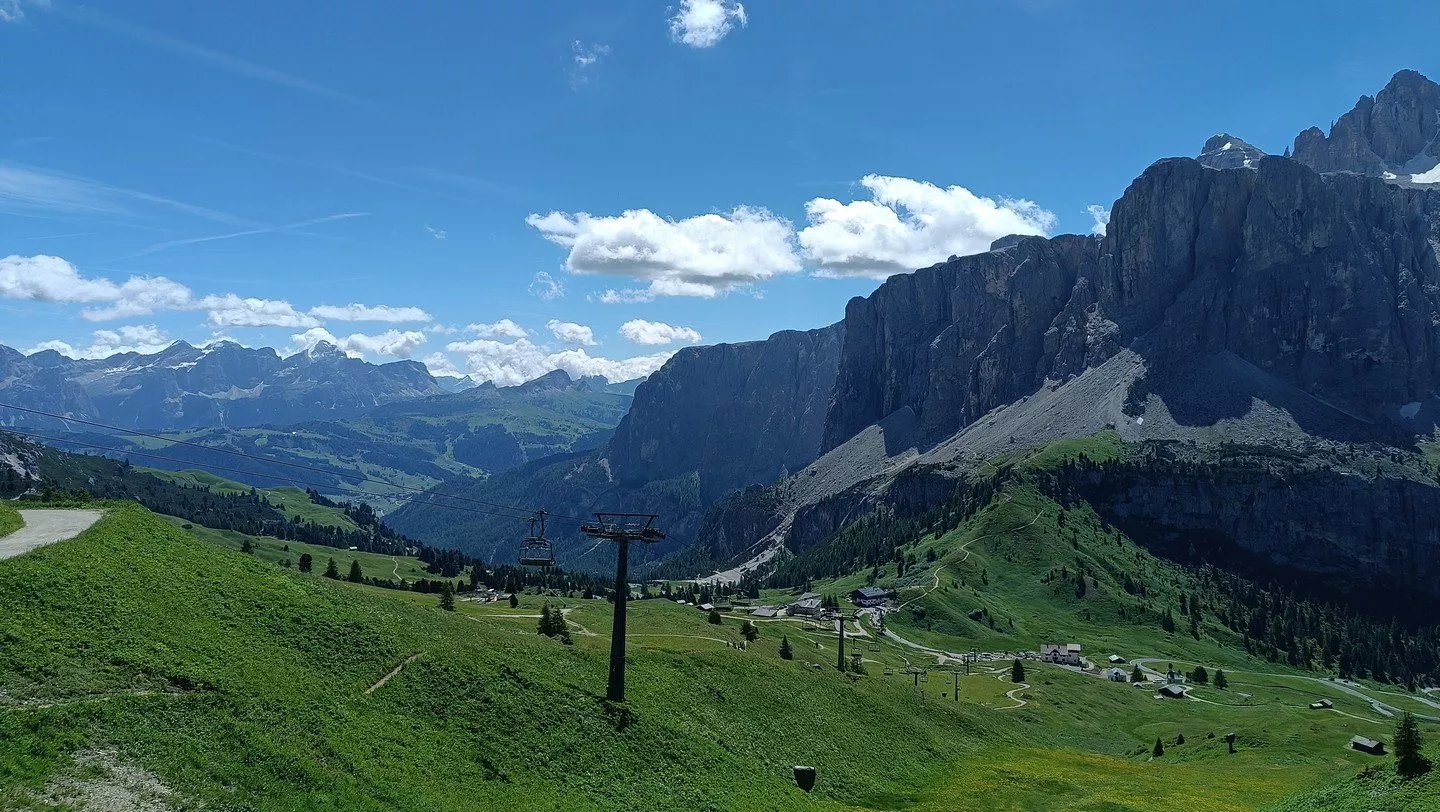 Opouštíme značenou trasu a po šotolce sjíždíme až k silnici a po ní se vydáváme k nástupnímu místu lanovky Fodom (1900 m n. m.), která nás vyváží na sedlo Pordoi. Na sedle se opět napojujeme na trasu trailu Sella Ronda CW, která je hned od parkoviště dost technická, ale velice hravá.
