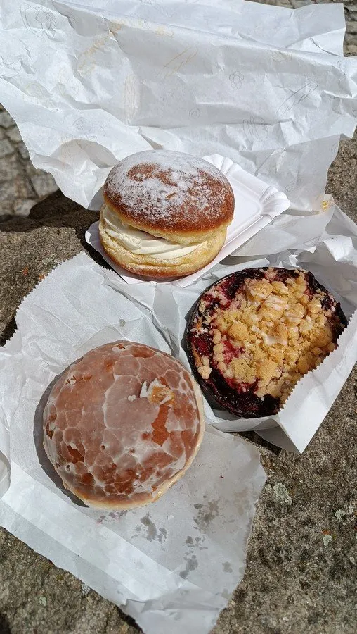 Hledáme však něco konkrétního a to pekárnu, kterou nám doporučil kamarád. Po nějakých 10 minutách hledání máme štěstí a narážíme u hlavního tahu na první pekárnu, krásně to tu voní. Volba byla jasná: švestkový koláček s drobenkou, v cukru máčená kobliha s ovocnou náplní, kobliha s krémem a borůvkami, to vše za 26 PLN. Výborná svačinka a dostatek energie na další kilometry, které začínají stoupáním po cyklotrase 4306 zpět k hranicím.