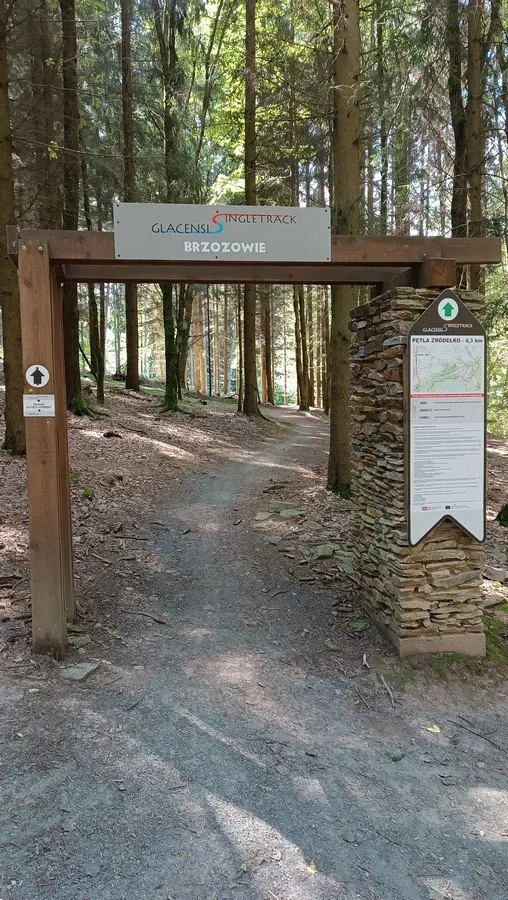 Před obcí Brzozowie míjíme stejnojmenné traily, které jsou zahrnuty do trailového souboru stezek nazvaných Glacensis Singletrack, které dobře znám z rozlehlé oblasti kolem Kralického Sněžníku. Byla by tedy škoda na traily nekouknout z blízka, proto vybíráme nejdelší okruh, který se vyznačuje i nejdelším stoupáním plným vraceček, kde se s gravelem hůře stáčíme, ale nakonec se snaha vyplácí a dostáváme se až na vrchol kopce Brzezie (495 m n. m.), odkud je pěkný výhled směrem na Kudowa-Zdrój a dále horský hřeben s vrcholem Skalniak (915 m n. m.).