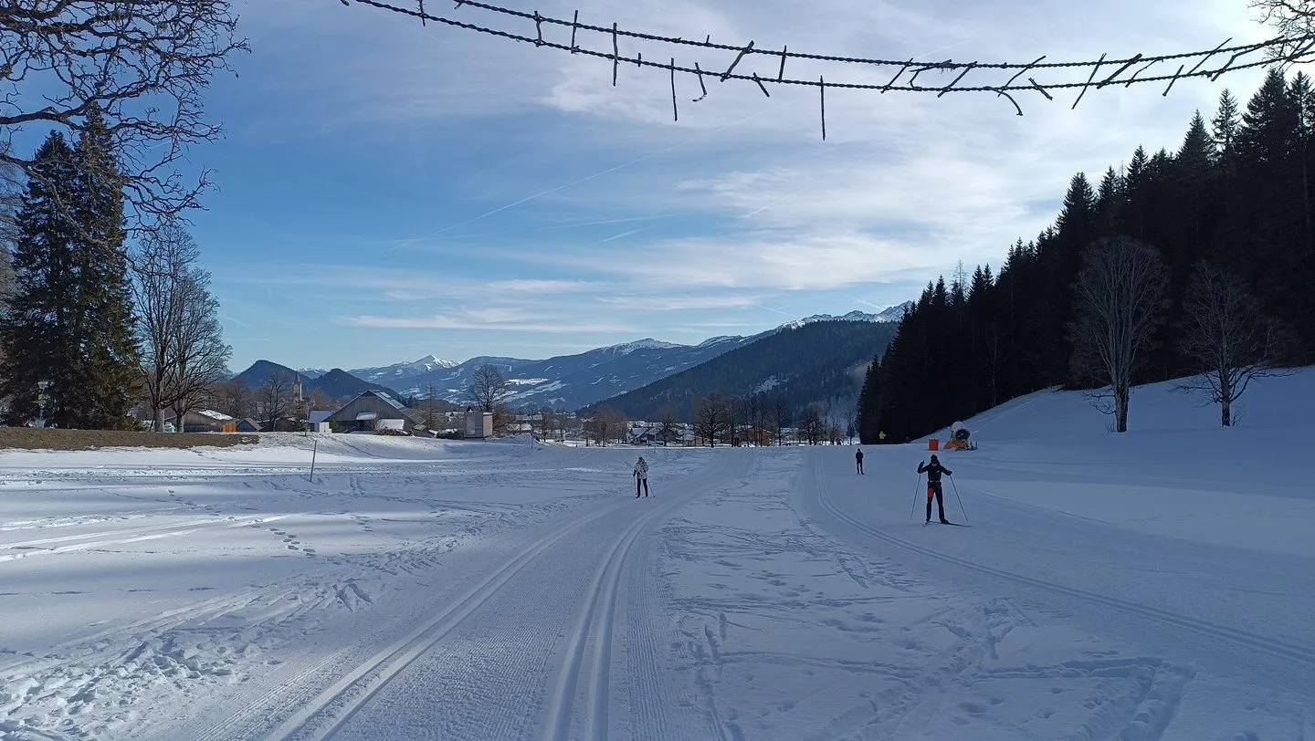 Ze stadionu se vydávám „načerno“ severozápadně souběžně se silnicí do mírného kopce až na úroveň restaurace Ederhof, za kterou v dáli vidíme samotný Hoher Dachstein (2995 m n. m.). Od restaurace stáčím mírně vlevo a následně podjíždím silnici, která vede k dědince Vorberg. Zde se stopy rozdělují na více stran a tak přichází trocha tápání, kam se vydat. Nakonec se i díky kvalitnímu zakreslení zimních tras v aplikaci mapy.cz vydávám krátkým, ale svižným sjezdem jižním směrem a za zády nechávám hlavní dominantu údolí, skalní masiv Dachsteinu.
