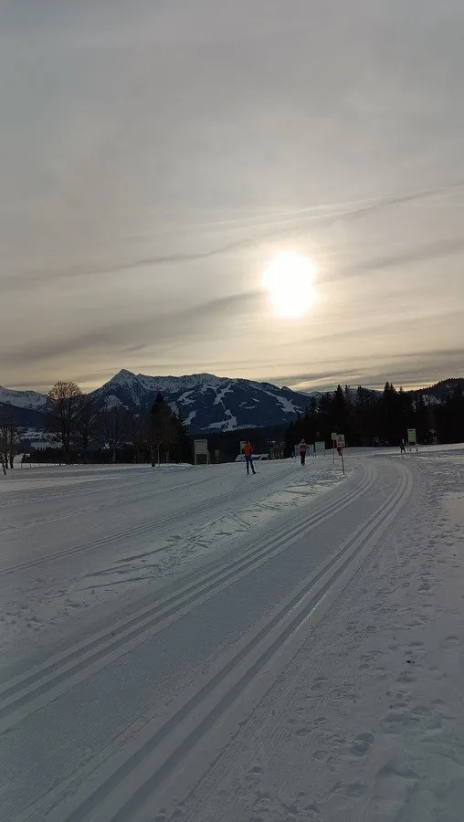 Venku se před blížící se frontou poněkud zatáhlo, ale stále je zhruba 5 °C pod nulou a my se opět rozdělujeme. Někdo se jde již jenom projít po okolí a Plevouš vyráží dojet zbytek Dachstein Runde. Od stadionu jedu tedy již známou cestou kolem hlavní silnice mírně do kopce až za podjezd silnice, kde jsem ráno trochu tápal, kudy kam. Na rozcestí se dávám doprava a mířím ke zdejšímu sjezdovému areálu s vrcholem Galsterberg (1495 m n. m.). Přecházím silnici a stojím pod sjezdovkou, vpravo mi padl do oka velký kemp plný karavanů a obytných přívěsů, říkám si, jak by bylo úžasné bydlet hned u lyžařské stopy.