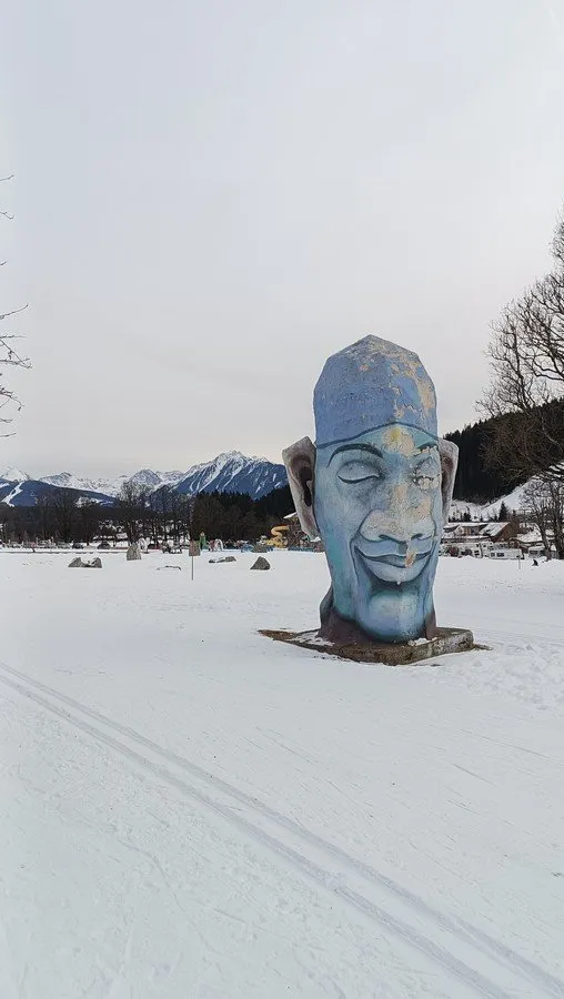 Pokračuji stále rovně až ke konci údolí, kde podél silnice teče říčka Schildlehenbach a já stáčím obloukem zpět. Stopa kopíruje silnici, za kterou si v jedné části všímáme dvou obrovských barevných hlav a třetí na mě dokonce čekala o kousek dále přímo u stopy. Zajímavé betonové dílo! Trať pokračuje kolem silnice několika obloučky, takový svižný cikcak nahoru a dolů a pomalu se dostávám ke kempu.