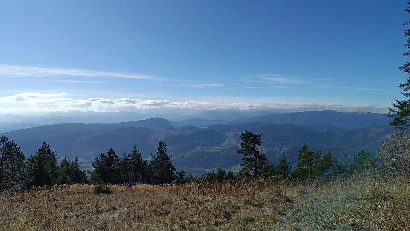 Stoupání nás lesem dovedlo k odbočce, kterou se vlevo dostáváme na vzletovou louku pro paraglidisty. Z louky je pěkný výhled, a dokonce je zřetelně vidět i vyhlídková plošina Skywalk, kde jsme ráno čekali na východ slunce. Na okraji lesa je postavená nefalšovaná kadibudka, tak se třeba někomu tato informace bude hodit.