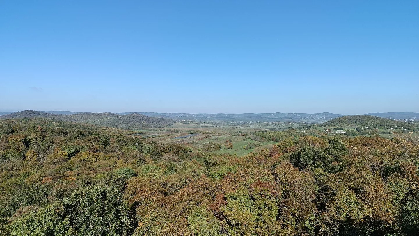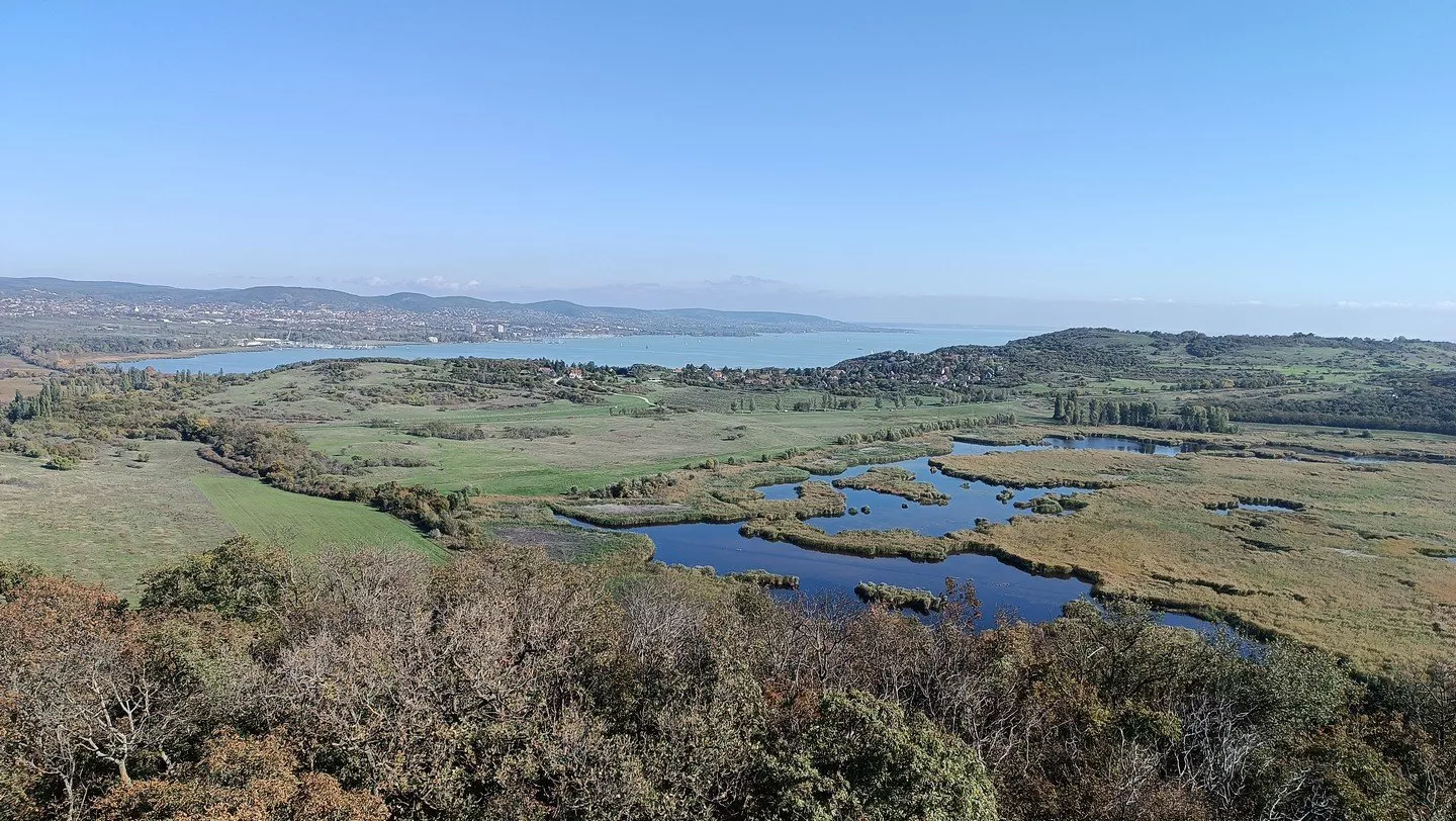 Stromy a keře ustupují a my již vidíme dřevěnou stavbu rozhledny, která byla vybudována v roce 2023. Vystupujeme na ochoz a kocháme se dalekými výhledy do kraje. Vše máme jak na dlani, vidíme velkou část Balatonu i nedaleká zmíněná jezera Belső-tó a Külső-tó. Trochu si připadáme jako někde na ostrově v Chorvatsku. Sluníčko příjemně hřeje, lehce pofukuje, až se nám nechce zdát, že je polovina října. Dáváme svačinu a užíváme si té krásy kolem.