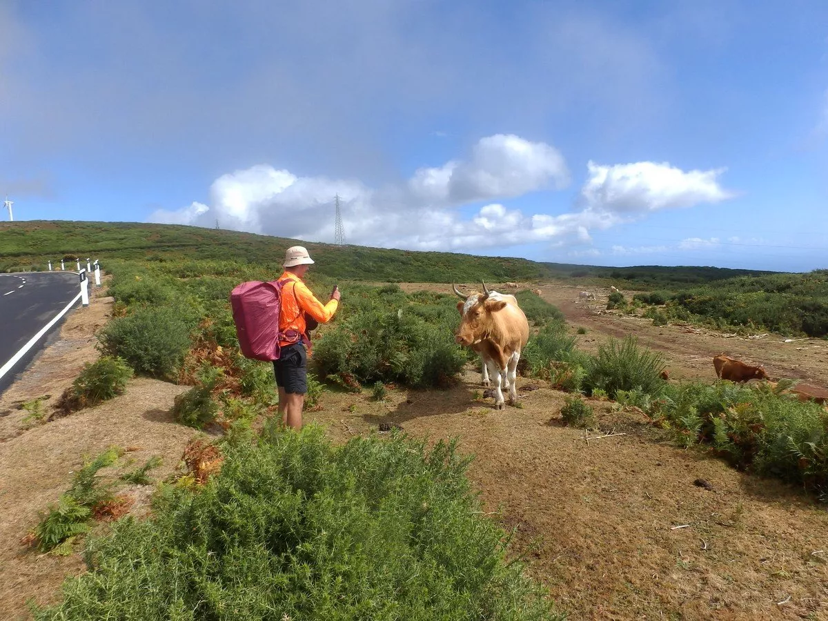 Platíme, konečně neprší a my pokračujeme dál po silnici až ke vstupu do národního parku Rabaçal. Kousek od motorestu je stádo krav, a tak si Plevič jednu krávu fotí. Pohladit se ale nenechá a dává to jasně najevo! Vlevo si všímáme výhledu kraje ostrova s oceánem, kde krásně svítí sluníčko a přejeme si, aby i nám začalo počasí přát.