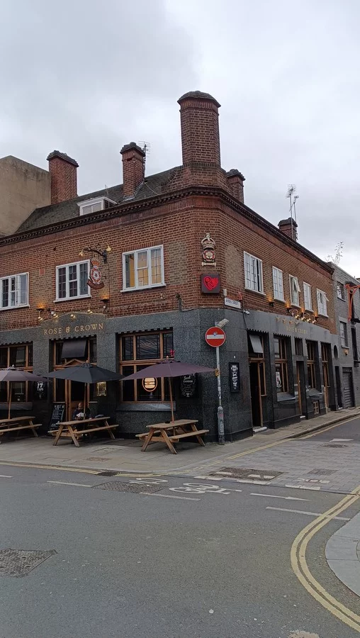 Blíží se 13 hodin a my z muzea míříme na plánovaný oběd, cestou na křižovatce ulic Southwark a Great Suffolk nás zaujala jedna budova v typickém anglickém stylu, stejně jako hospůdka s hostelem Rose & Crown, která je naším cílem. Za barem je několik píp, a tak si vybíráme k hamburgeru každý jiné pivo, ať můžeme porovnat. Fotřík zkusil kávový speciál Fierce beer Cafe racer 6,5% a Plevič si dal Guiness. Výborný speciál barvou připomínal spíše hodně tmavé červené víno i díky tomu, že bylo bez pěny a Guiness připomínal i chutnal jako silnější pivo.
