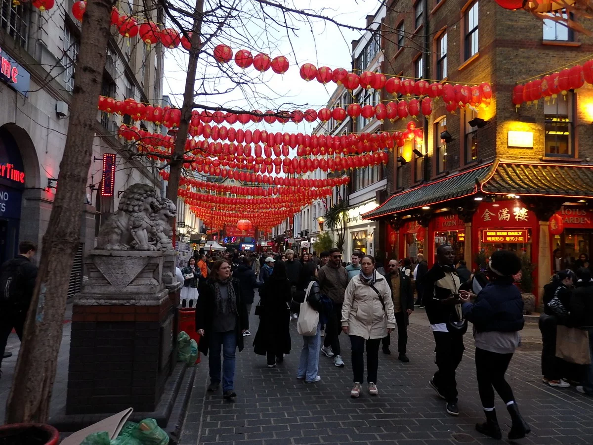 Po prohlídce se přesouváme na stanici metra Lambeth North, což je vlastně svým způsobem také muzeum. Stanice nás překvapuje již svým točitým schodištěm, po kterém se do metra vstupuje a dále doslova historickými vozy z roku 1972, které na severní lince jezdí. Metrem se „teleportujeme“ ke křížení s tmavě modrou severovýchod-západní trasou, kde vystupujeme a pokračujeme pěšky směrem do čínské čtvrti, která je krásně vyzdobená červenými balónky a v 15:45 jsou tady davy lidí.