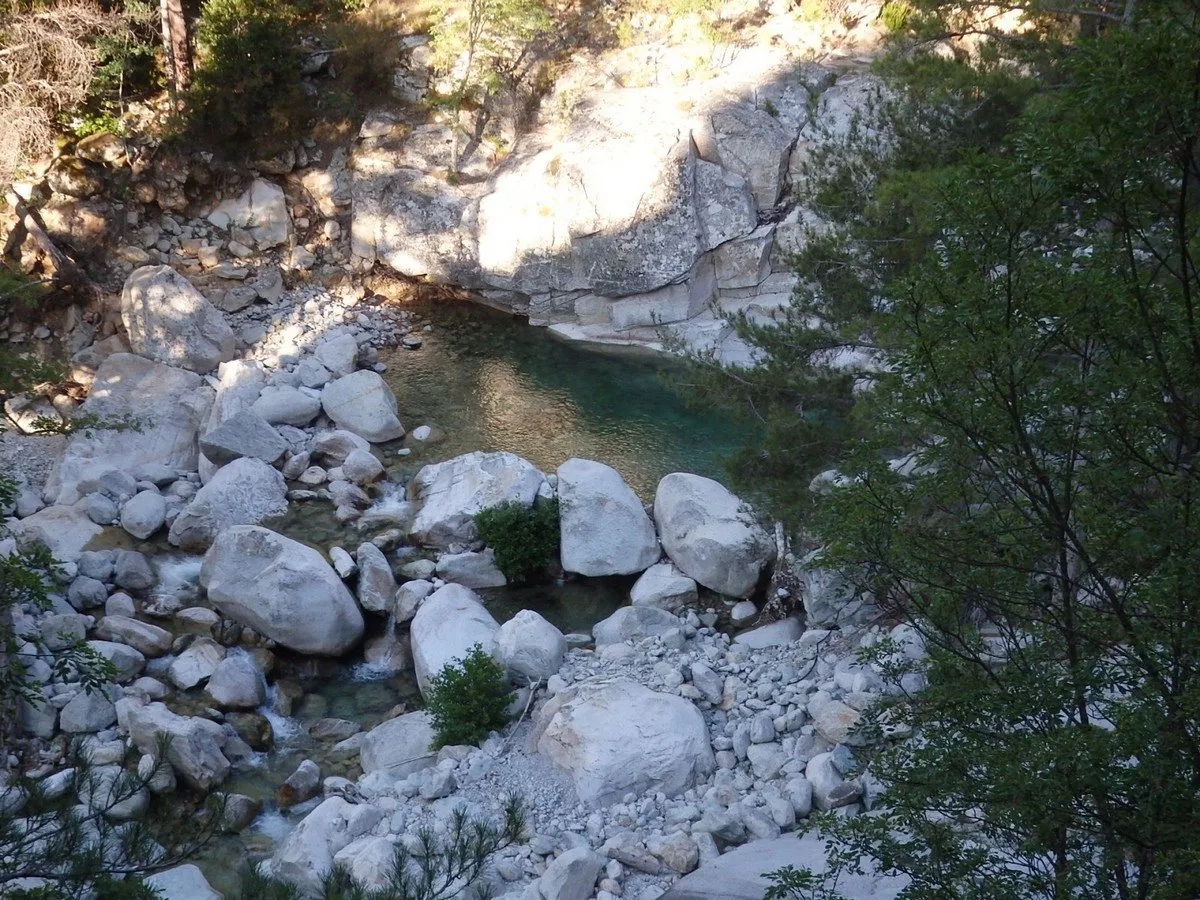 Byla to mimo jiné obrovská tragédie i pro cestovní ruch v okolí města Corte, protože toto krásné údolí do té doby ročně přilákalo více jak sto tisíc návštěvníků. V místech u restaurace, kde stojíme, dopadl 60tunový kus skály, který ji naštěstí minul. Pro udržení cestovního ruchu byla tedy zřízena i kyvadlová doprava mikrobusem, který nahradil osobní vozy, které by zde nebylo možné nikde odstavit. Bohužel nešlo o jedinou přírodní pohromu poslední doby. V srpnu 2000 zde řádil ničivý požár, po kterém lze i dnes najít pozůstatky v podobě ohořelých stromů, které jsou i přes to vše v korunách již opět zelené, ač kůra či části kmenů vzrostlých borovic jsou černé od ohně.