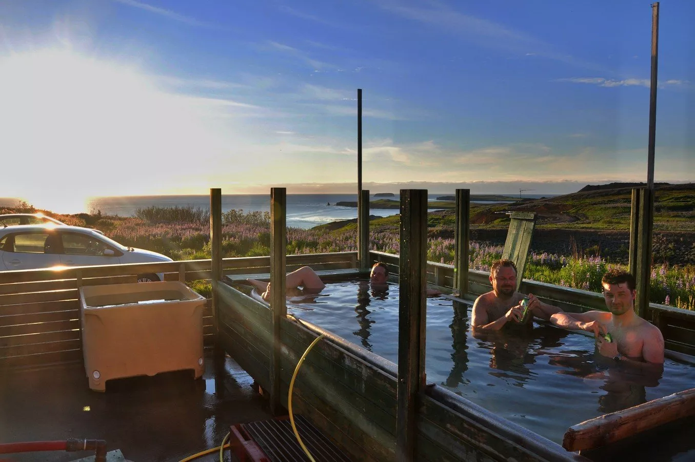Jsme tu v těch pár dnech z roku, kdy slunce vůbec nezapadá a rozhodli jsme se toho využít. Nejdřív se ale chceme vykoupat v termálních lázních na severu města. Soukromý investor zde čerpá horkou termální vodu o teplotě 39 stupňů do plastových van a další horkou vodu rozvádí dále. Kdo ví, možná že ji táhne až do nově otevřených lázní Geosea.