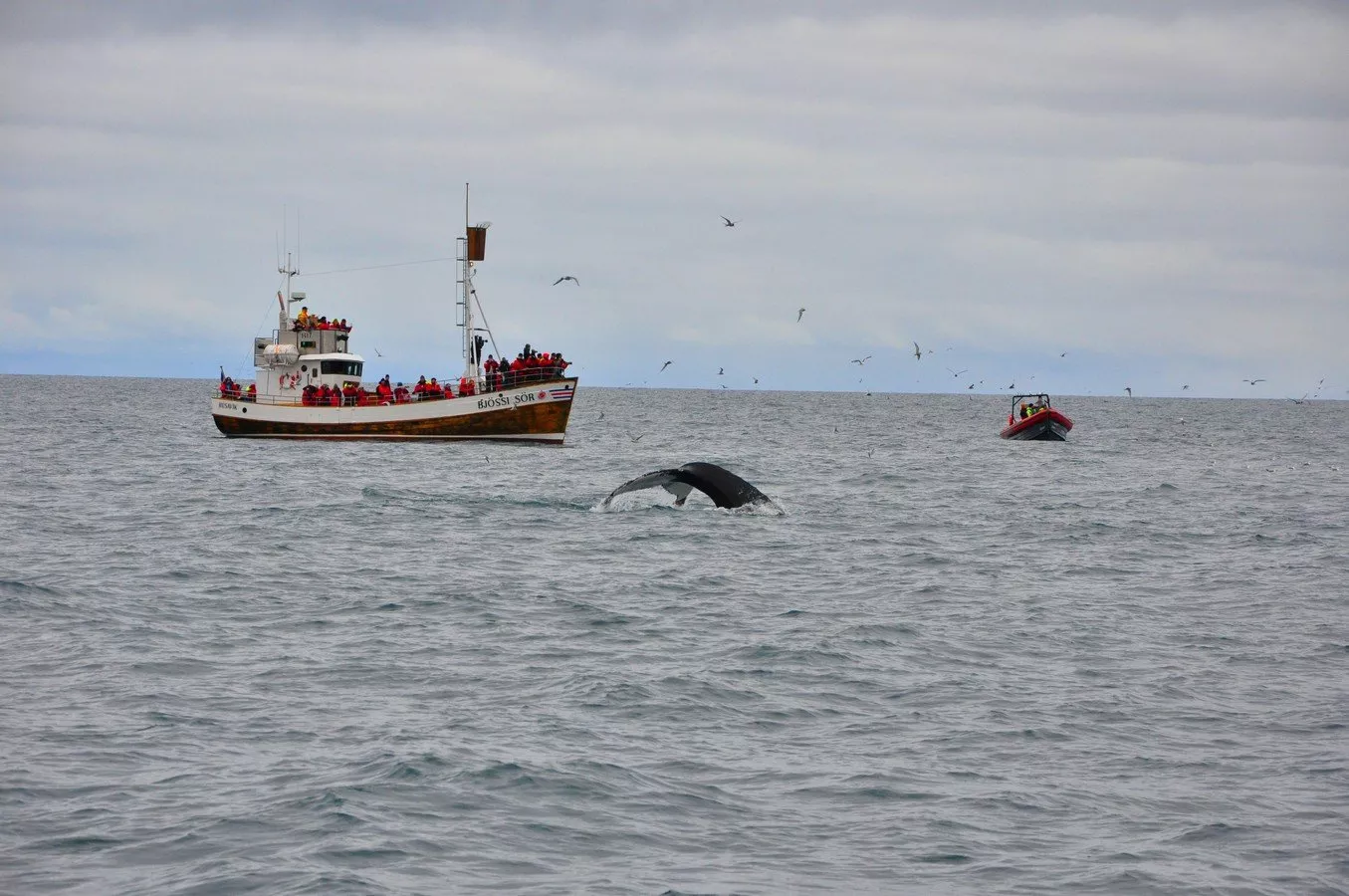 Nastupujeme na loď se jménem Faldur, jejíž název by mohl také symbolizovat respekt k oceánu a jeho záhadám. Je to typická dřevěná rybářská loď mírně přestavěná pro potřeby turistů sledující krásy místního zálivu Skjálfandi. Vyplouváme a chladný vzduch nás šlehá do tváří. Nadšení z očekávání však překonalo všechny nepohodlnosti. Hledáme spolu s posádkou první velryby, zatím však vidíme jen krásné ptáčky papuchalky.