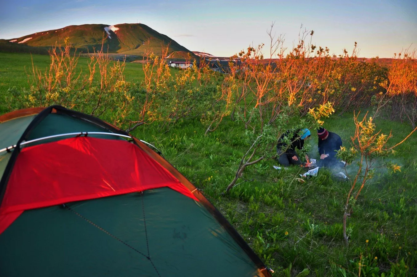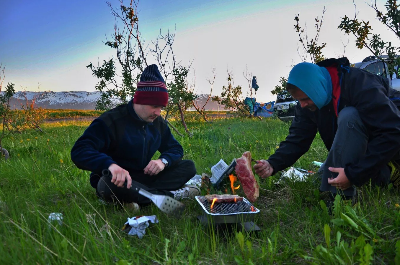 Sedli jsme si do závětří na trávu za keř a zapálili gril. Uhlíky vzplály a my na ně samou nedočkavostí hned hodili jehněčí steaky. Oheň samozřejmě ihned uhasnul a maso se jen dusilo v kouři. Složitě jsme se snažili gril opět rozhořet, abychom si maso upekli. Uhlí na propečení masa nakonec stačilo a my si ho mohli vložit do housek a dát si vlastně už pořádnou snídani. Vždyť byla jedna hodina po půlnoci a sluníčko těsně nad obzorem nás při polykání šťavnatého masa stále oslňovalo. Najedeni zalézáme do stanu a do spacáku, oči si přikrýváme rukavicemi, aby byla alespoň trochu tma. Těžko by se normálně usínalo, jsme ale unaveni a dlouho nám to netrvá.