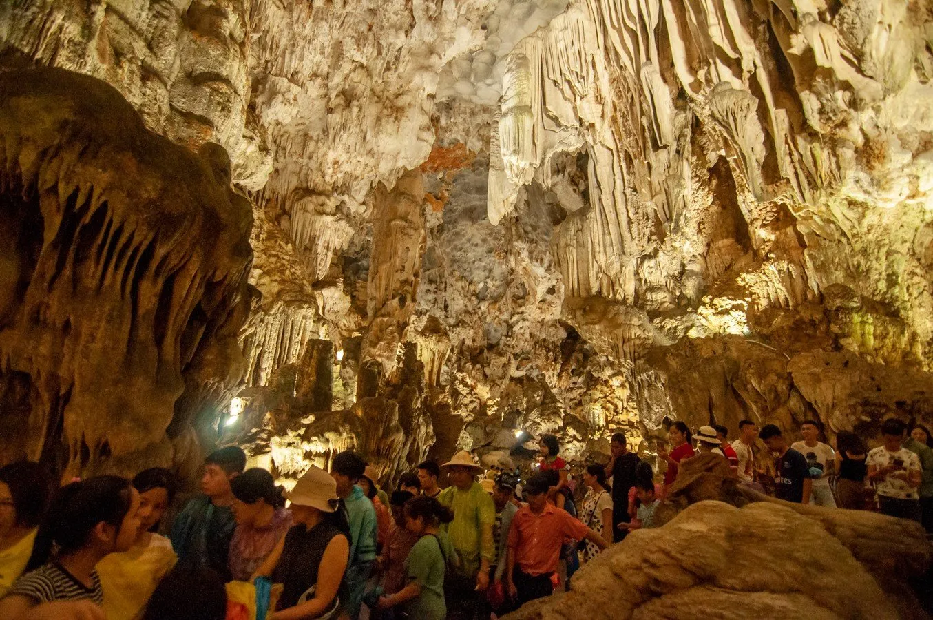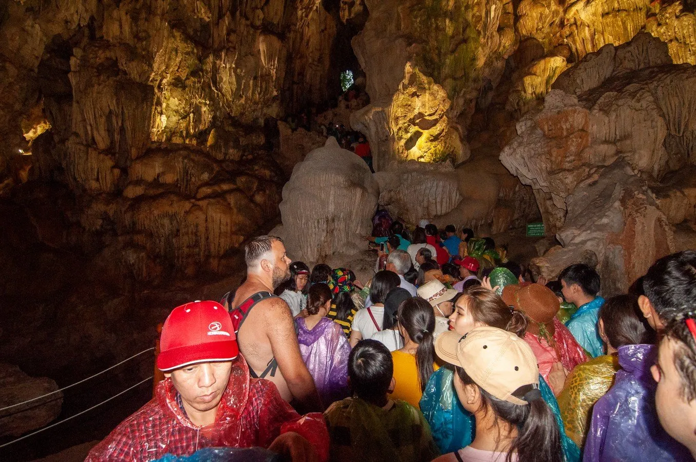 Naštěstí uvnitř jeskyně je petrifikovaná světnice a voda tam nezateče. Strmé schody vedou dolů, mírně mokré jsou jen od kapajících pláštěnek, či našich promočených triček. Jeskyně je krásná s obrovskými komorami a krápníkovou výzdobou. Některé stalaktity jsou až deset metrů vysoké. Jen tu není žádné intimní ticho. Spíš fronta ve stylu „krok, sun, krok, sun“, připomínající řady turistů čekajících na vstupenky do Vatikánu. Samá selfie a obdivné narážky ve vietnamštině.