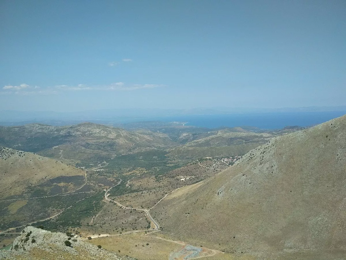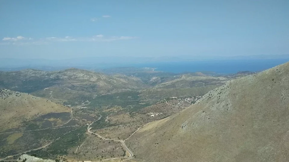 Parkujeme na jediném rovném místě vedle vysílače a vyrážíme k vrcholu s kapličkou proroka Eliáše. Je to impozantní podívaná. Z 800 m n. m. máme vše jak na dlani a vidíme i oblast, kde leží náš kemp nebo celý horský masív Taygetos. Na vrcholu trávíme nikým nerušeni bezmála půl hodinky a užíváme si té nádhery všude okolo. Vidíme mimo jiné vstup do jeskyně, včetně pláže Diros, kde jsme se před pěti hodinami koupali, ale také krásné městečko Areopoli s navštívenou střešní restaurací.