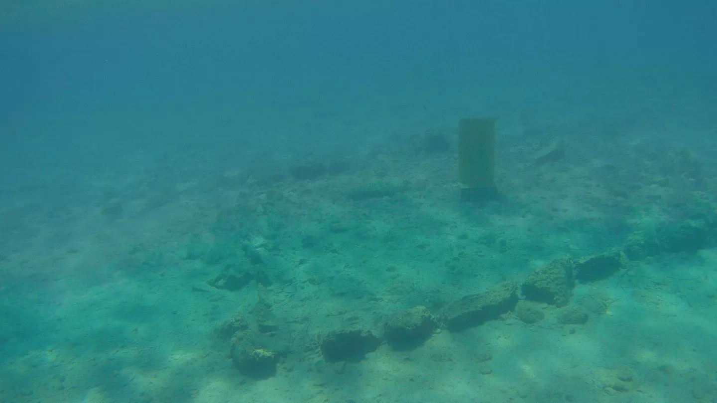Ač se to nezdá, moře je dost rozbouřené a ve vlnách se plave blbě. Cestou nalézáme pod hladinou označené pozůstatky budov, které pokračují v pásu až ke břehu, kde je také tabule, která i díky bójkám pomáhá znázornit, o jak velkou osadu šlo.