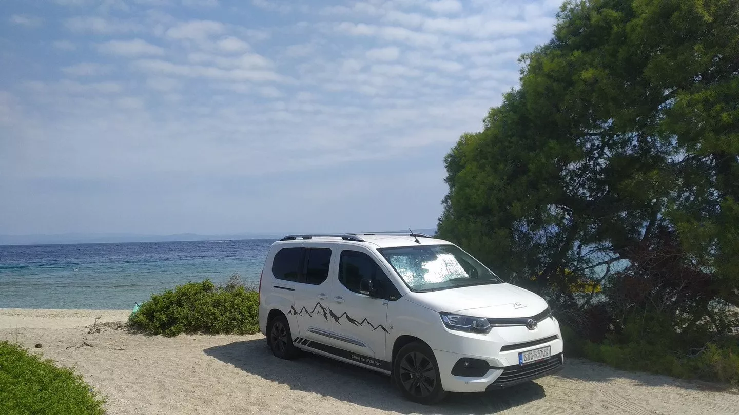 Po vydatném, chutném a hlavně cenově přijatelném obědě se kolem 14 h s paní loučíme a přesouváme se na nedalekou zmíněnou pláž Possidi Beach. Jde o podobný výběžek, jako známe z Chorvatska na ostrově Brač, kterému se říká Zlatni rat. Vzhledem k tomu, že i na tomto řeckém „ratu“ je spousta lidí, byl docela problém najít místo na zaparkování. Bereme nejnutnější věci a jdeme se po výborném obědě osvěžit do moře.