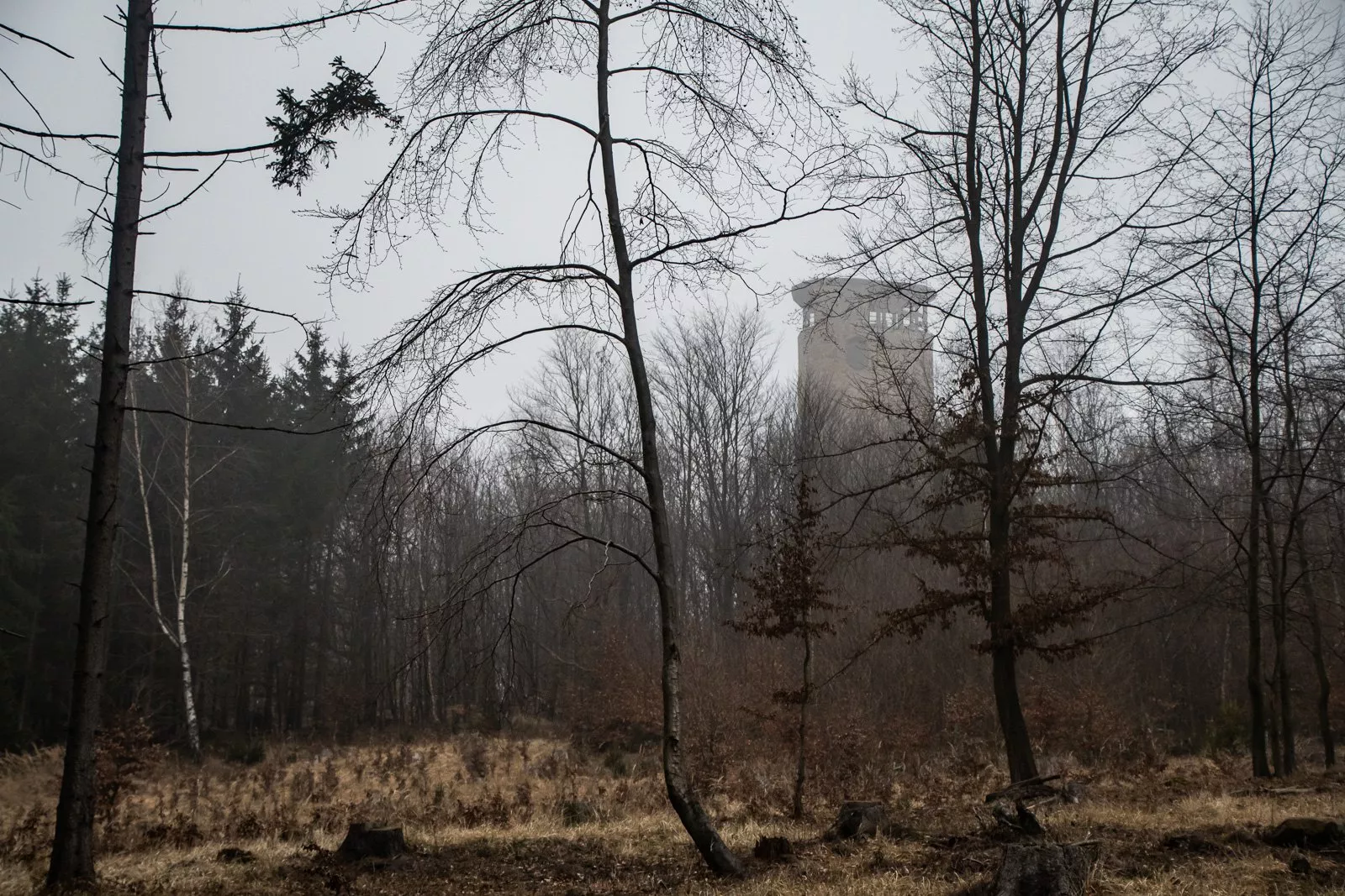 Tady jsem se otočil a vypravil se zpět. Ještě jsem vylezl k rozhledně, ale dopředu jsem od toho neměl velká očekávání, protože bylo dost hnusné počasí, na Chřibech se válela už několikátý den v řadě mlha a jak se dalo tušit, začátkem března je rozhledna zavřená. Otevře se až v dubnu. Tedy podle informačních cedulí z roku 2024.