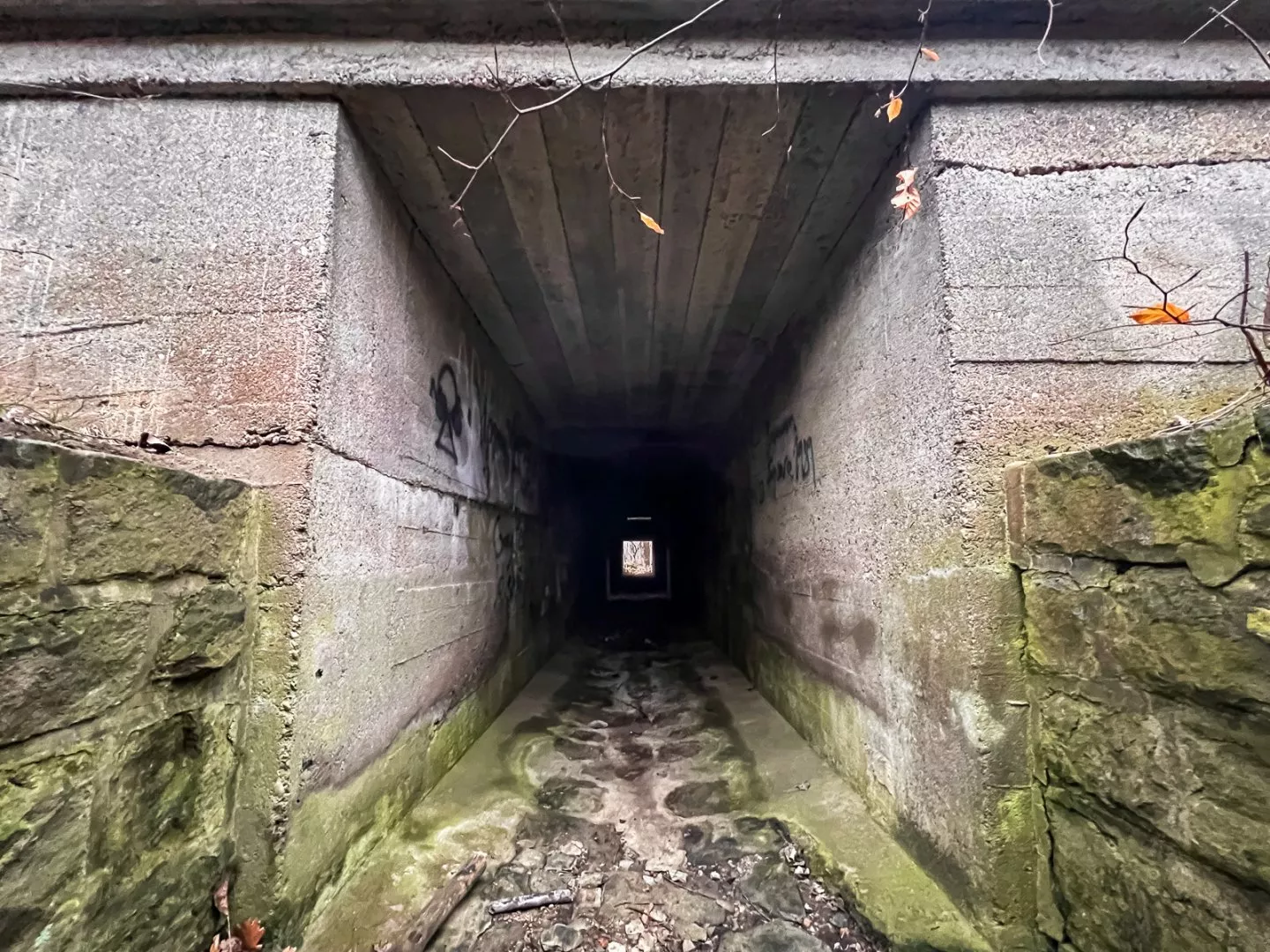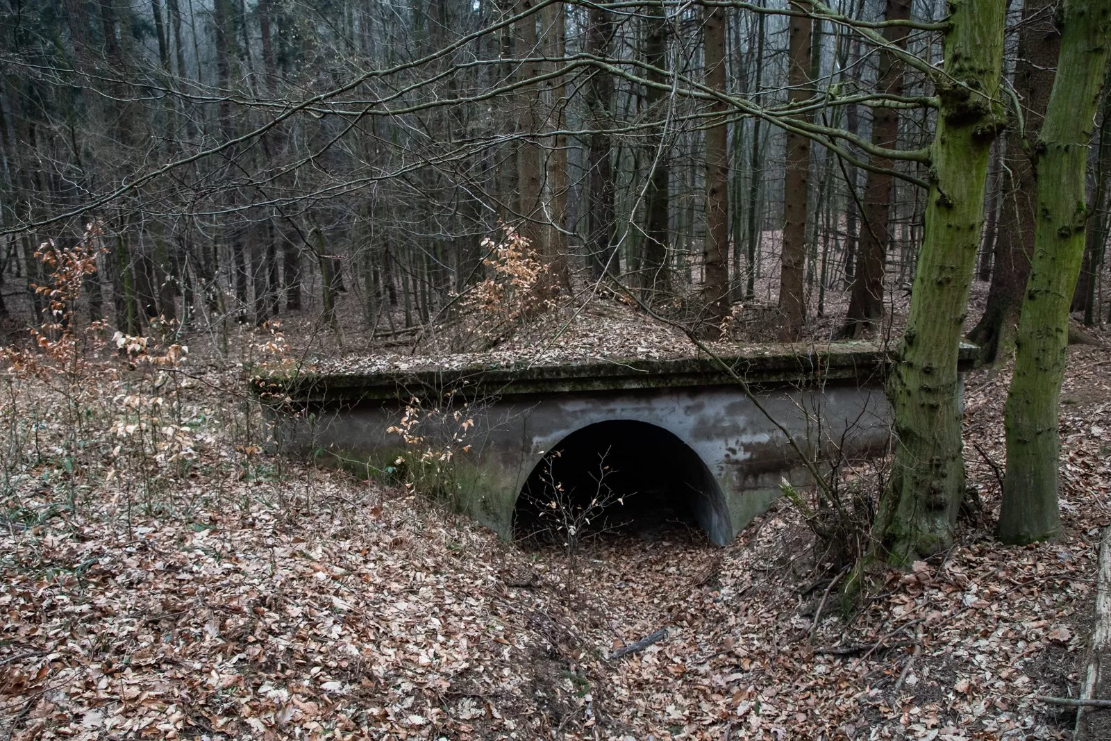 Od mostních pilířů stačí opět popojít jen pár stovek metrů, abyste narazili na další propust. Dálnice v těchto místech měla vést o něco níže, než je turistická cesta, takže je to další atrakce, kvůli které je potřeba opustit pohodlí široké cesty. Já jsem posléze ještě došel k jedné zajímavě vypadající propusti, která je opět pár stovek metrů za odbočkou k rozhledně Brdo. Její horní část je z cesty vidět, takže byste to neměli minout.