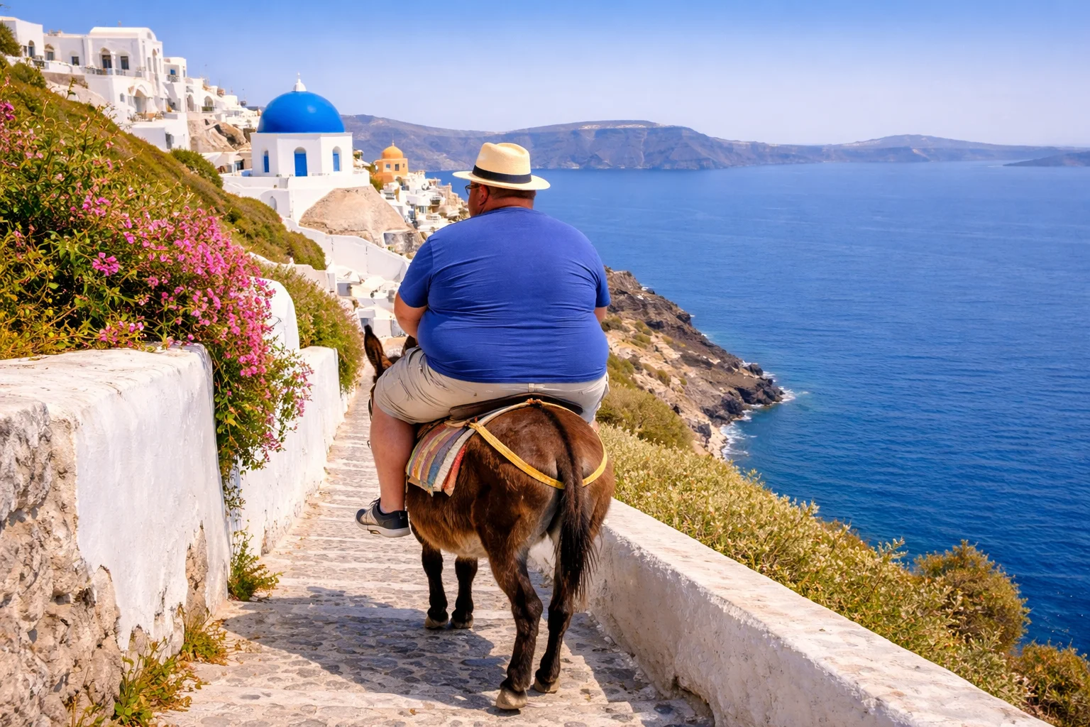 Na řeckém ostrově Santorini se každé léto opakuje stejný scénář. Tisíce turistů vystoupí z výletních lodí v přístavu a chtějí se dostat do hlavního města Fira. Cesta ale vede strmě vzhůru. Jednou z variant je využít vlastní nohy, případně je tu ještě lanovka. Třetí možností je nechat se vyvézt na hřbetě osla nebo muly, to ale v posledních letech už hraničí s neetickým zacházením se zvířaty, protože se z toho stal jednoduše byznys.