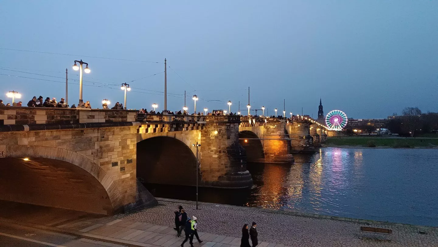 Z hlavního náměstí přecházíme na jiné nedaleké náměstí Neumarkt s dominantou v podobě kostelu Panny Marie. Procházíme mezi desítkami stánků a míříme směrem k Labi, cestou míjíme katedrálu Nejsvětější Trojice. Naším cílem je velké vysoké kolo, které na druhé straně řeky hraje všemi barvami. Přecházíme přes kamenný Augustův most a celou dobu sledujeme, jak kolo mění barvy a grafiku. Je to krásná podívaná a i když začíná postupně více pršet, tak nám to tak nějak nevadí.