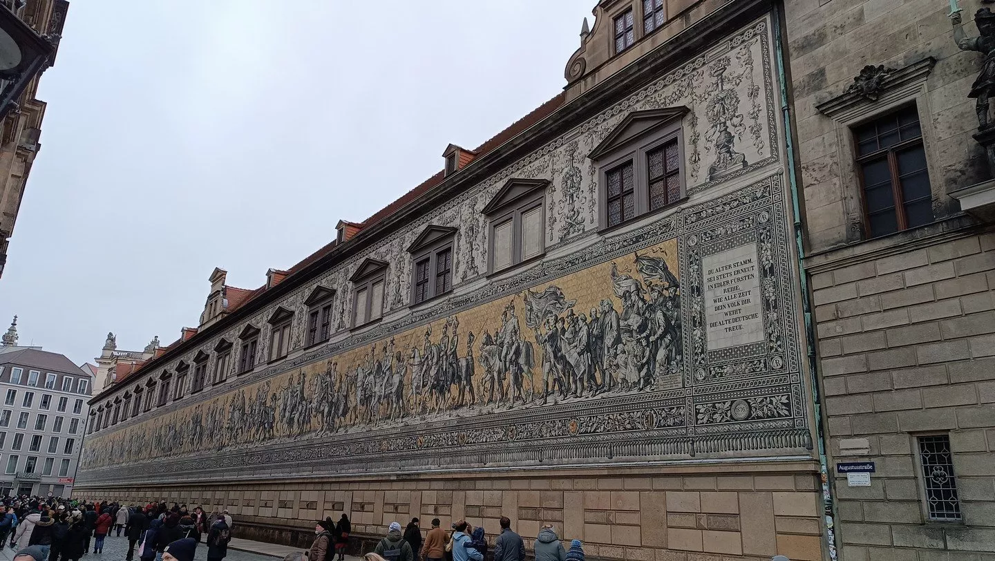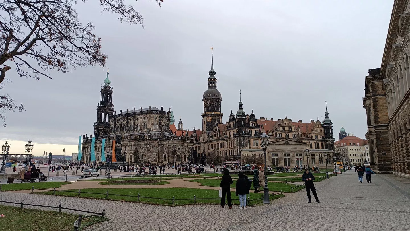 Procházíme kolem Semperovy opery a komplexu barokních budov Zwinger na hezké a rozlehlé náměstí Theaterplatz se sochou pomníku krále Jana I. Saského na koni, který se dívá na impozantní katolickou katedrálu Nejsvětější Trojice. Mezi katedrálou a zdí zámku Hausmannsturm podcházíme kryté přemostění a míříme na zámecké náměstí, kde stáčíme vpravo a průchodem po zámecké ulici míříme na prostranství, kde jsou první stánky s vánoční tématikou a především svařákem.