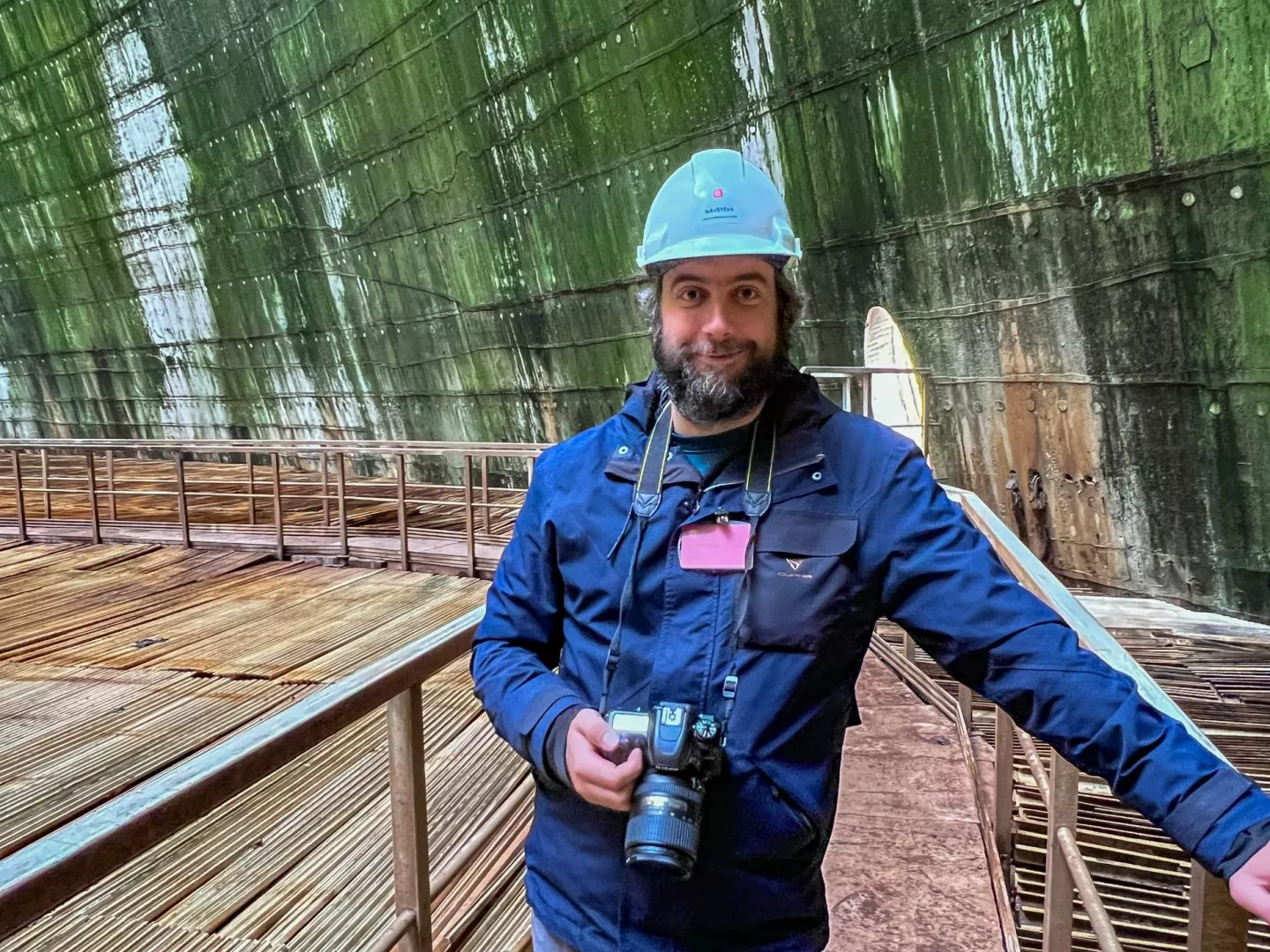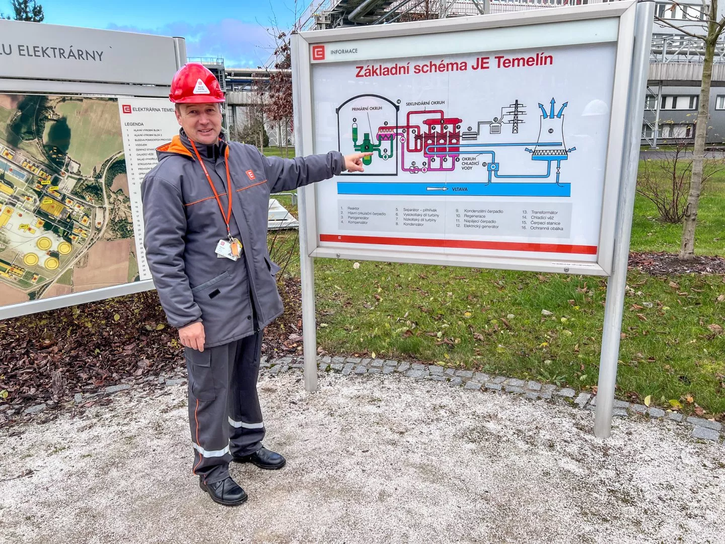 Průvodce, v mém případě to byl tiskový mluvčí elektrárny Marek Sviták, postupně popisuje, co je v jaké budově. Kromě chladicích věží jsou nepřehlédnutelnou dominantou dva bloky. Každý obsahuje vysokou válcovou budovu, na kterou navazuje dlouhý červený barák. To kulaté je budova reaktoru, to dlouhé je strojovna s turbínou.