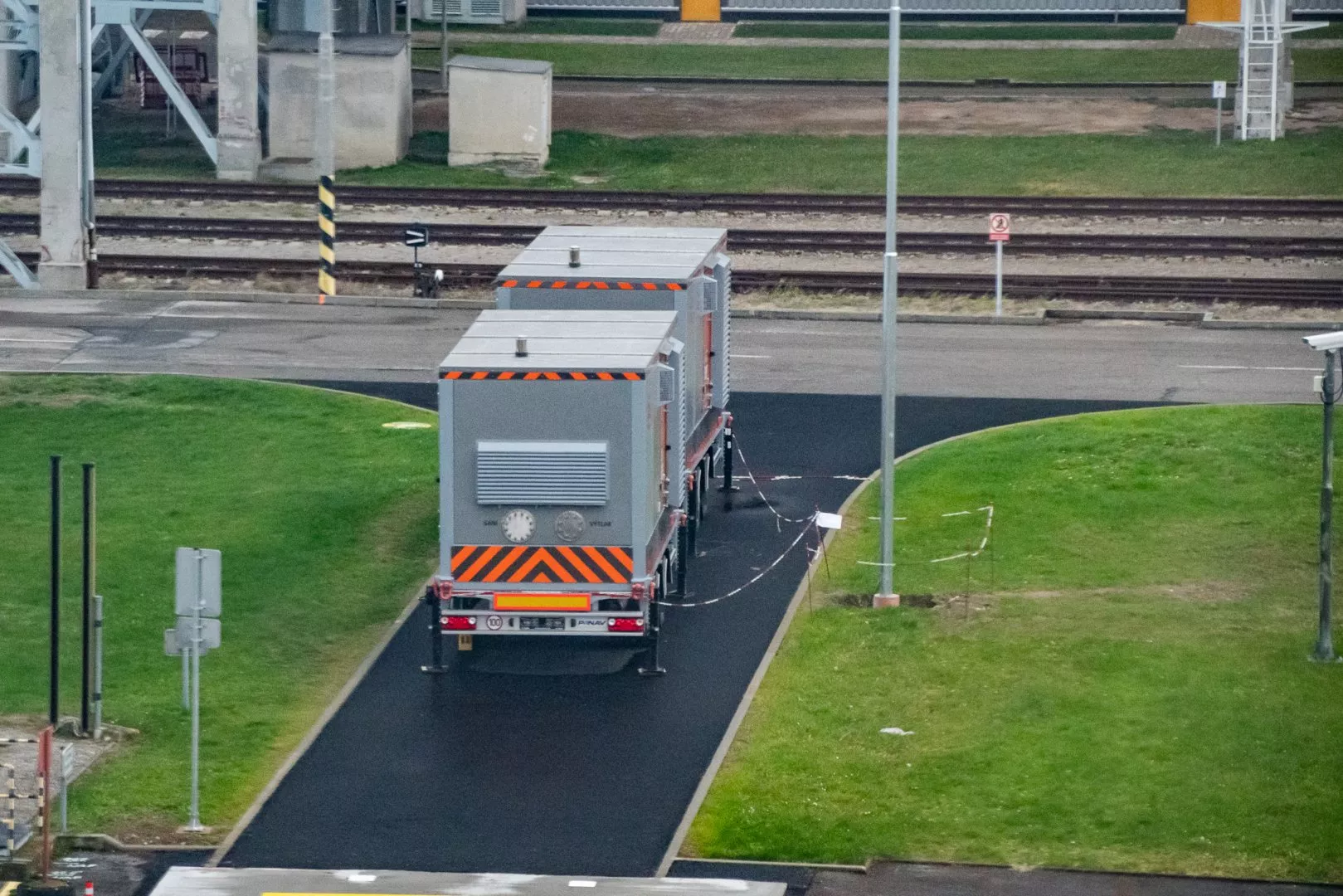 S Markem jsme pak pokračovali venku dále směrem k chladicím věžím. Po cestě si můžete všimnout třeba obrovských transformátorů, kde se mění napětí z 24 kV od generátoru na 400 kV. Tohle není specialita Temelína, ale běžná součást každé elektrárny. Dělá se to kvůli ztrátám na vedení vysokého napětí překonávajícím velké vzdálenosti. Specialitou ale rozhodně jsou dva takové malé nenápadné vozíky odstavené tak nějak uprostřed areálu.