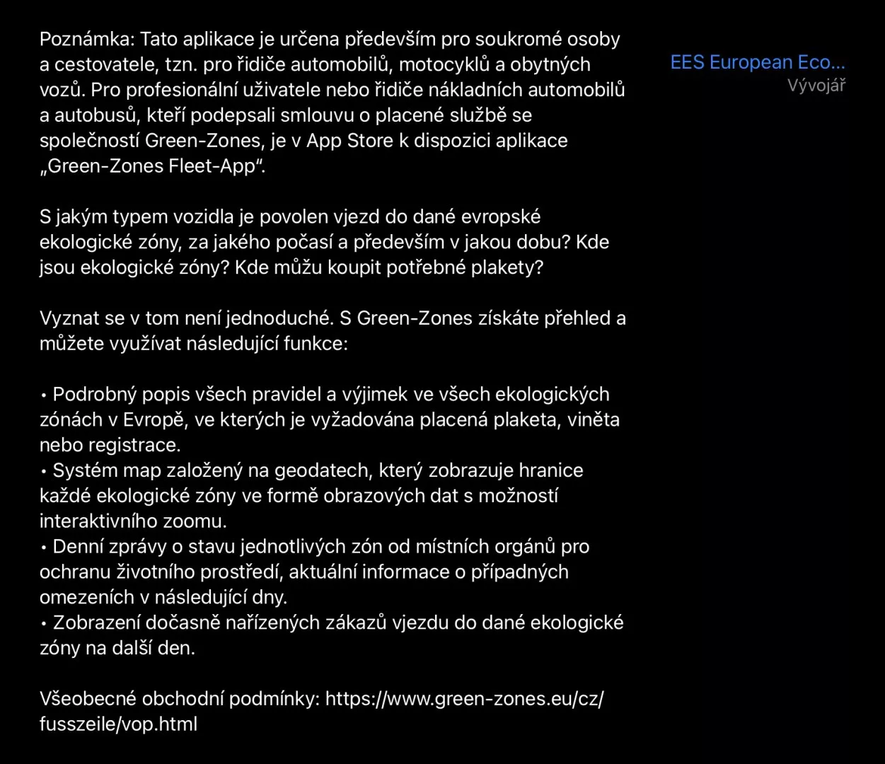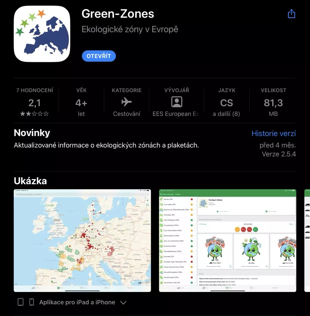 Dobrým pomocníkem na cestách je určitě i aplikace Green-Zones, kterou si můžete stáhnout jak pro iOS, tak Android. Najdete v ní vždy aktuální informace o zónách v celé Evropě, jestli v místě existují nějaká omezení či se můžete podívat, zda se váš cíl nachází v ekologické zóně. Při aktivaci aplikace zadejte osobní automobil, pak můžete tuto aplikaci používat zdarma a pro potřeby běžného cestovatele je to dostačující. Pokud zadáte např. obytný vůz, pro zobrazení podrobností po vás budou chtít zakoupit předplatné.