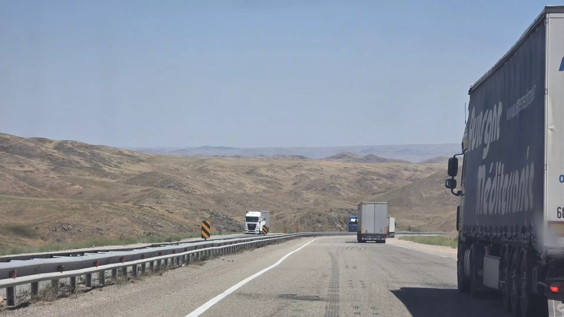 Okolo 14:30 jsme konečně opustili bránu přístavu a vjeli na území Kazachstánu. Museli jsme spěchat, jelikož jet v noci s našimi auty, která pořádně nesvítí, bylo velmi riskantní. Jenže na plyn jsme moc šlapat nemohli, jelikož stav místních silnic byl katastrofální. Několik kilometrů jsme dokonce museli absolvovat po nezpevněné prašné cestě, na které nás míjela rychleji jedoucí auta a náklaďáky.