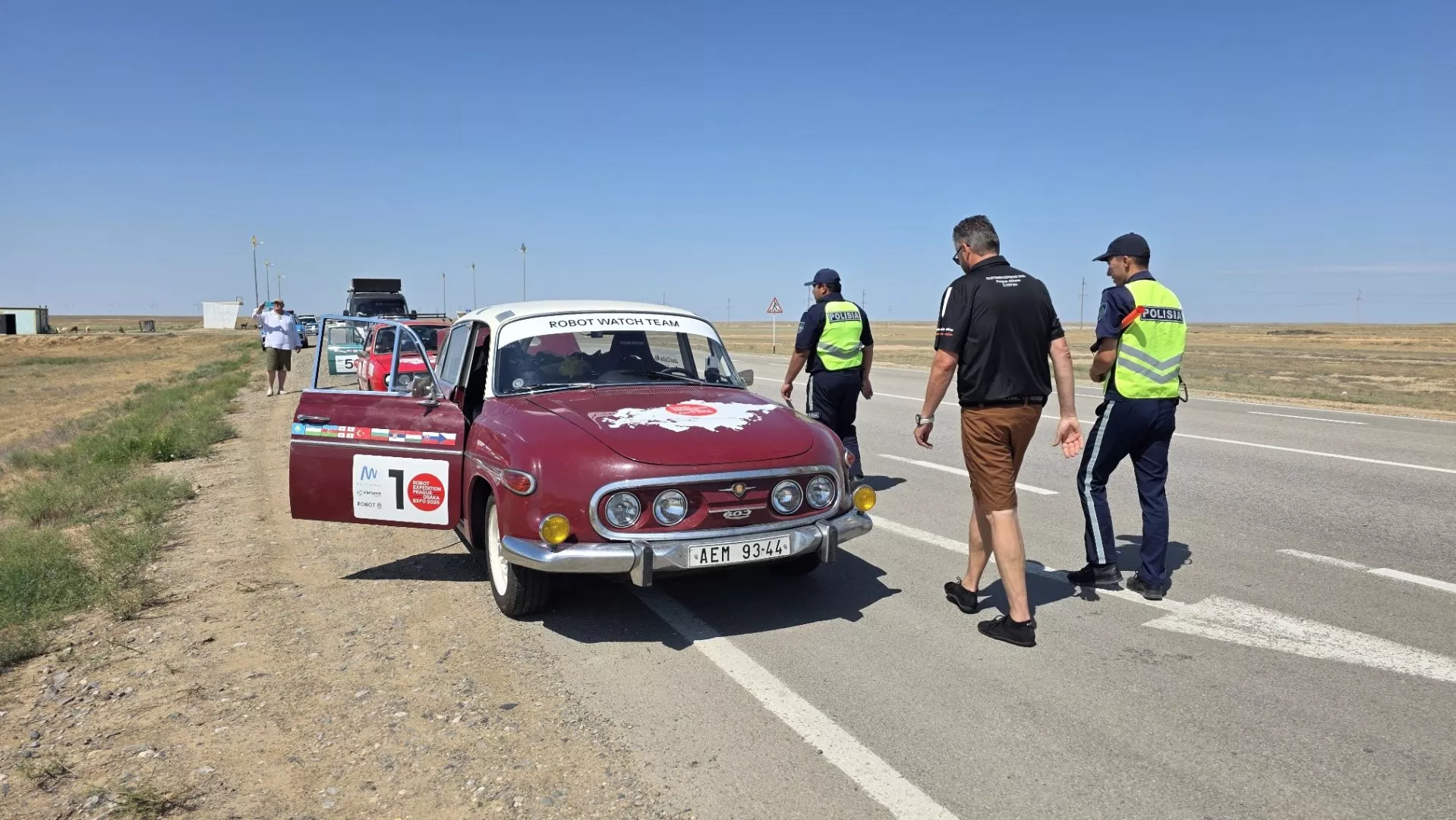 Po vylodění z trajektu přes Kaspické moře se výprava sedmi automobilových veteránů vydala na strastiplnou cestu přes celý Kazachstán. Úkol zněl jasně, za čtyři dny projet celou zemí, kde jsou široko daleko jen pouště a stepi. Byly to jednoznačně ty nejnáročnější etapy, které jsme doposud absolvovali. Nicméně auta to zvládla bez jediného zaškobrtnutí.