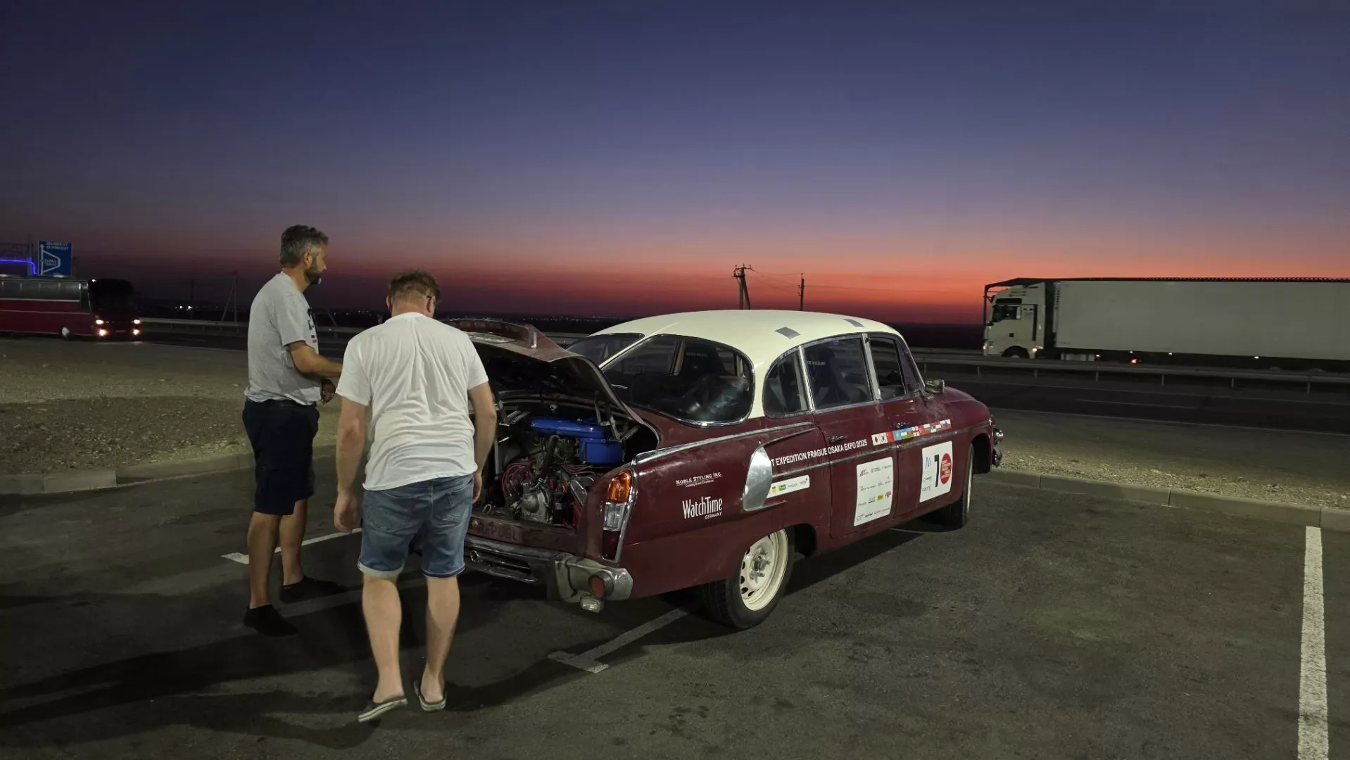 Jenže netrvalo to dlouho a Tatra se opět začala dusit. Museli jsme znovu zastavit, tentokrát naštěstí na moderní čerpací stanici, kde mechanici měli klid na práci. Na pravé části vidlicového osmiválcového motoru našli dva kabely vedoucí ke svíčkám, které se prodřely a probíjely. Valdemar Vašenda a Martin Haša kabely nahradili, z palivové hadičky vytvořili izolaci, aby se problém neopakoval, a opět Tatru oživili. Opět to vypadalo, že motor konečně poběží jako hodinky. Jenže při testovací jízdě se všechny ty symptomy vrátily. „To budou nečistoty v karburátoru,“ řekli mechanici.