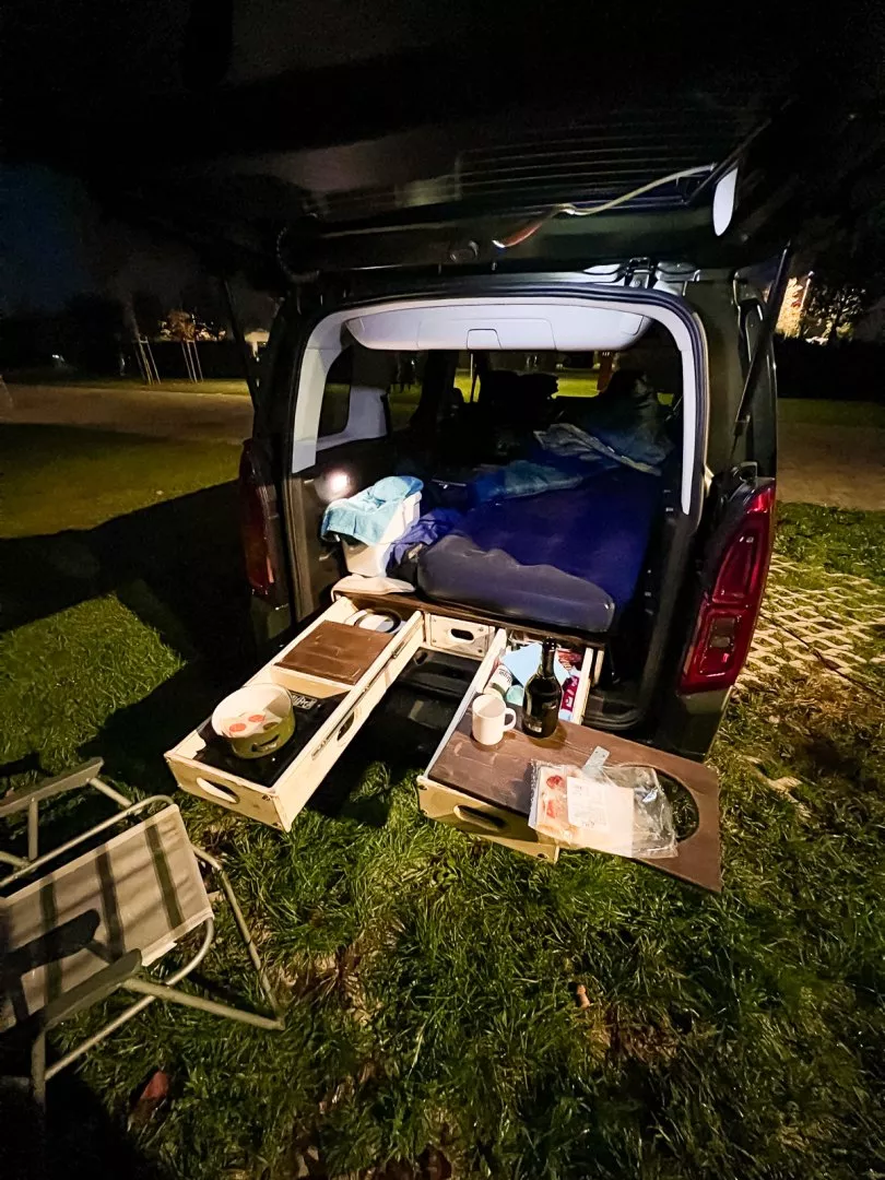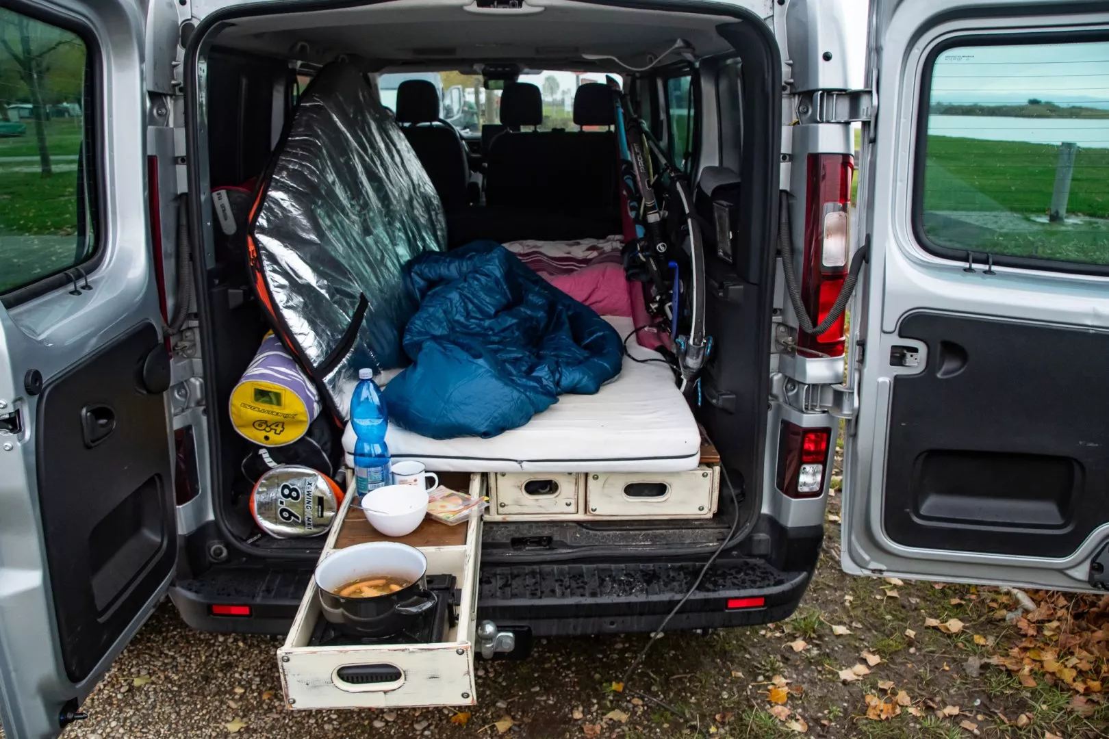 - Jeden šuplík je kuchyň s vařičem, další dva jsou na odložení různých věcí. V autě je i kanystr a tekoucí voda.