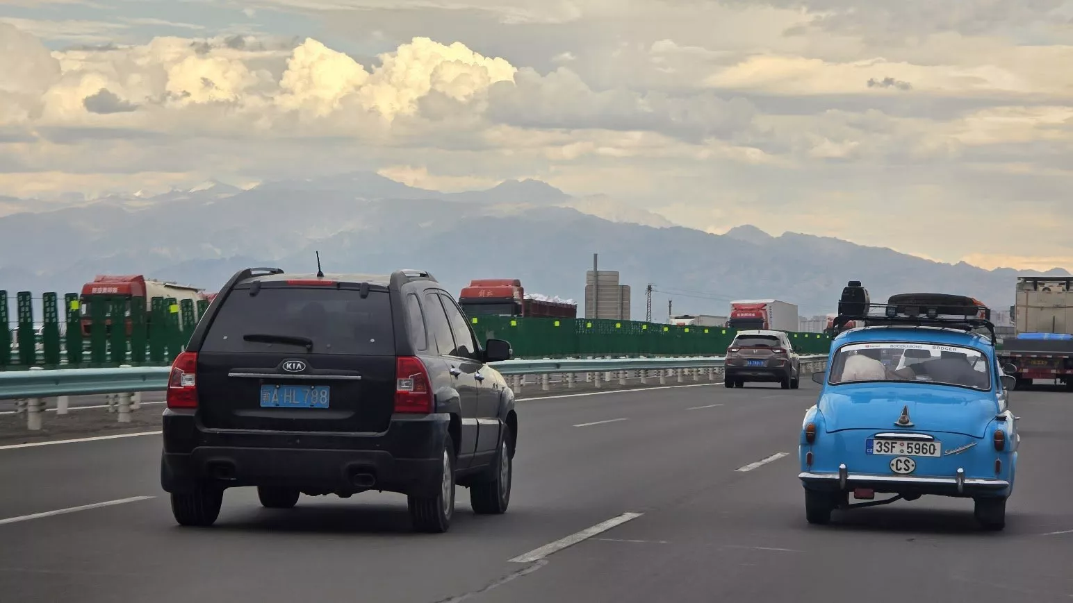 Hned, jak jsme vyjeli do Číny, okolní krajina se změnila k nepoznání. Zatímco Kazachstán byl pouze samý písek, na čínské straně hranice jsme kolem sebe měli samou zeleň. Všude byly stromy, keře a plodiny. Zhruba po 150 kilometrech jízdy jsme začali stoupat do vysokých hor. „Kam se hrabou Alpy,“ říkali jsme si za volantem našich veteránů šplhajících do strmých kopců.