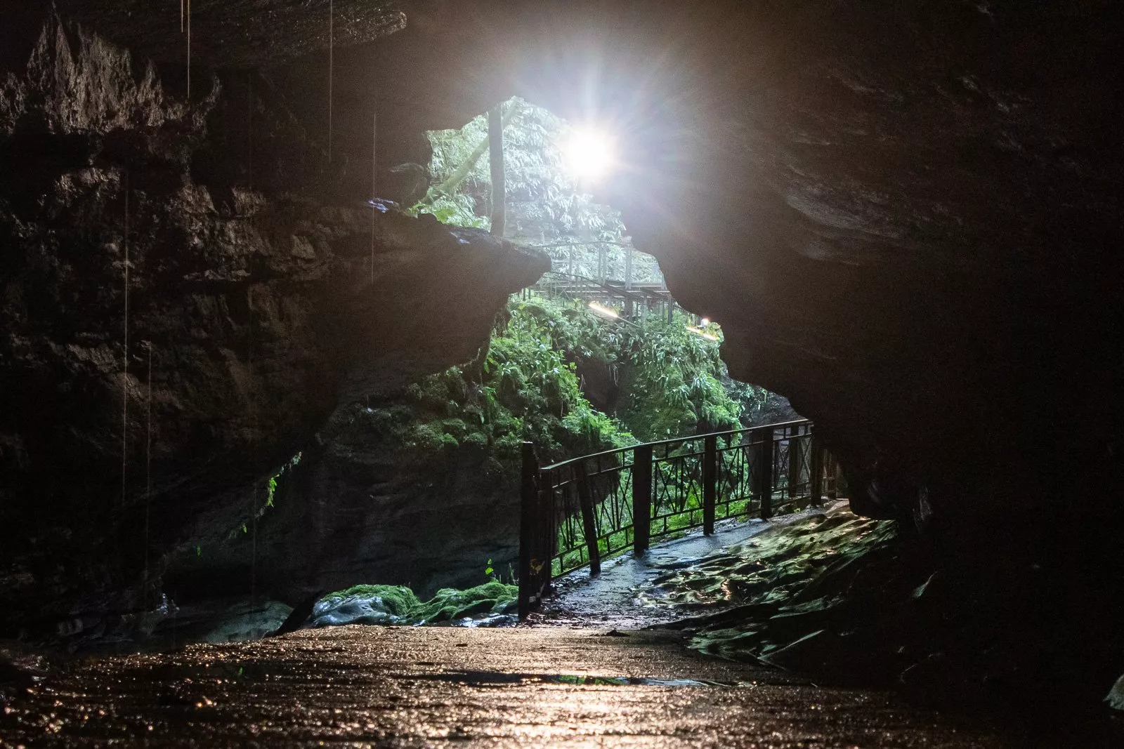 Od jeskynní kaple pak následuje sestup po schodech do hluboké rokle. Tady najdete kombinaci můstků, tekoucí vody, jeskyní a lávek. Celé to dohromady dává parádní podívanou, která přitom není úplně náročná. Dá se to zvládnout i s malými dětmi. Jen je občas nutné dávat trochu pozor. Dole jsou tři menší jeskyně, jedna z nich nebyla v době naší návštěvy přístupná. Zřejmě kvůli většímu množství vody. Vstup do jeskyně byl za říčkou. Suchou nohou bychom se tam asi nedostali.