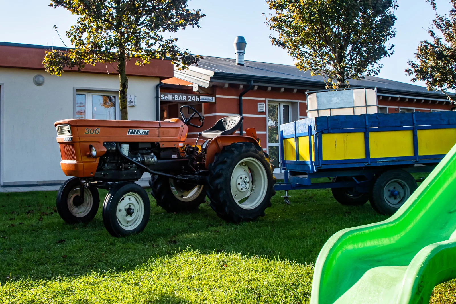 Koncem listopadu tu bylo samozřejmě jen pár aut a já jsem tu byl s malinkou osobní dodávkou poněkud za exota, nicméně kemp to je pěkný. Místa jsou velká, sprchy a záchody čisté, je tu také prostor pro psy, nějaká ta dětská hřiště a tak podobně. A hlavně se ukázalo, že tu používají starý traktor Fiat, který jsem během téhle cesty viděl o pár dnů dříve v Turíně v muzeu.