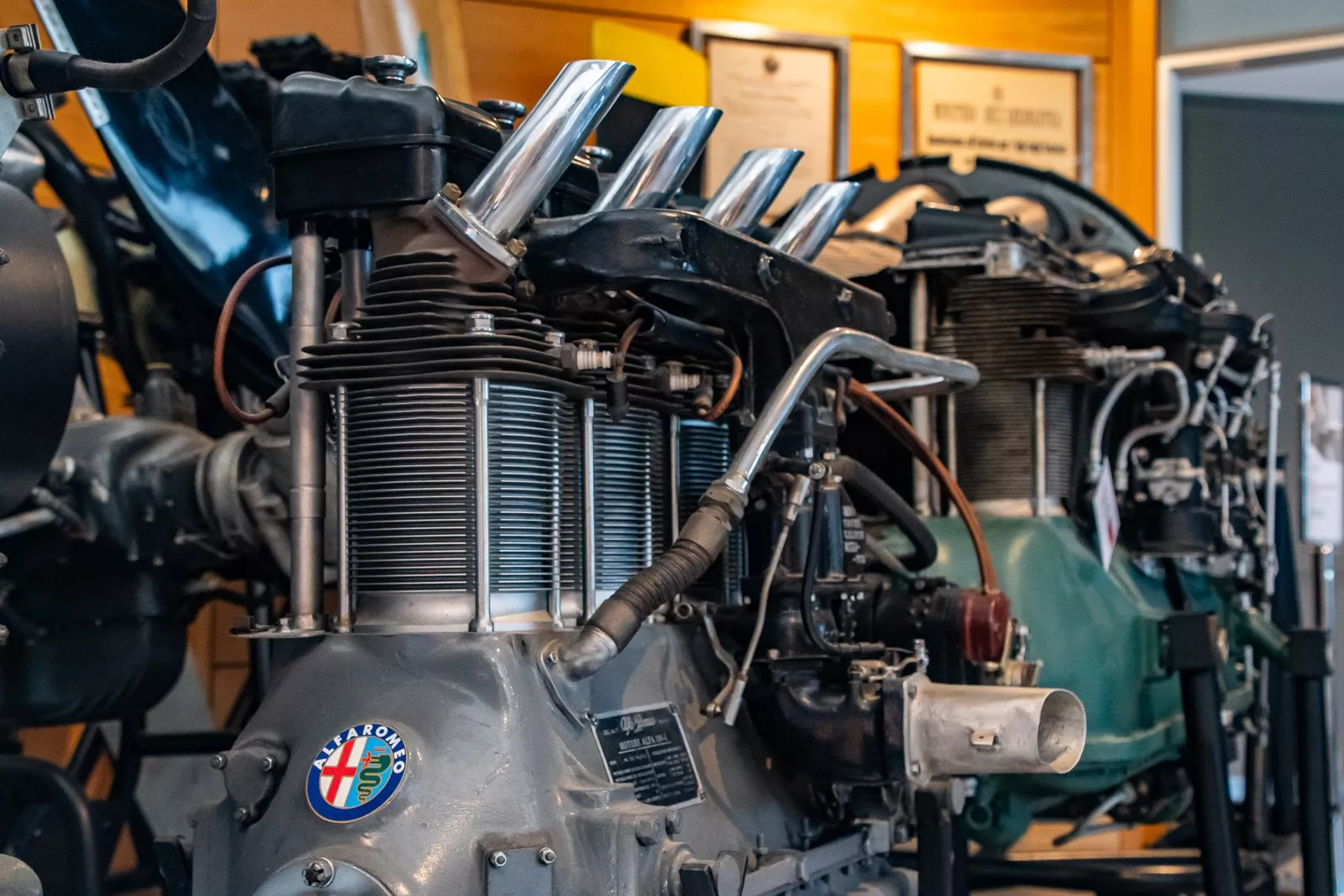 Když budete pokračovat výše, čeká na vás další pouť po mechanických záležitostech různého typu. Je tu množství motorek, ale také jízdních kol. U těch nejstarších si budete říkat, jak na tom vůbec mohl někdo jezdit. Hezké jsou i letecké motory. Je tu například letecký motor Alfa Romeo, který používalo letadlo Fiat postávající na střeše. U motorů visí pod stropem něco jako první dron. V muzeu uvidíte i první skútry nebo část věnovanou světlometům.