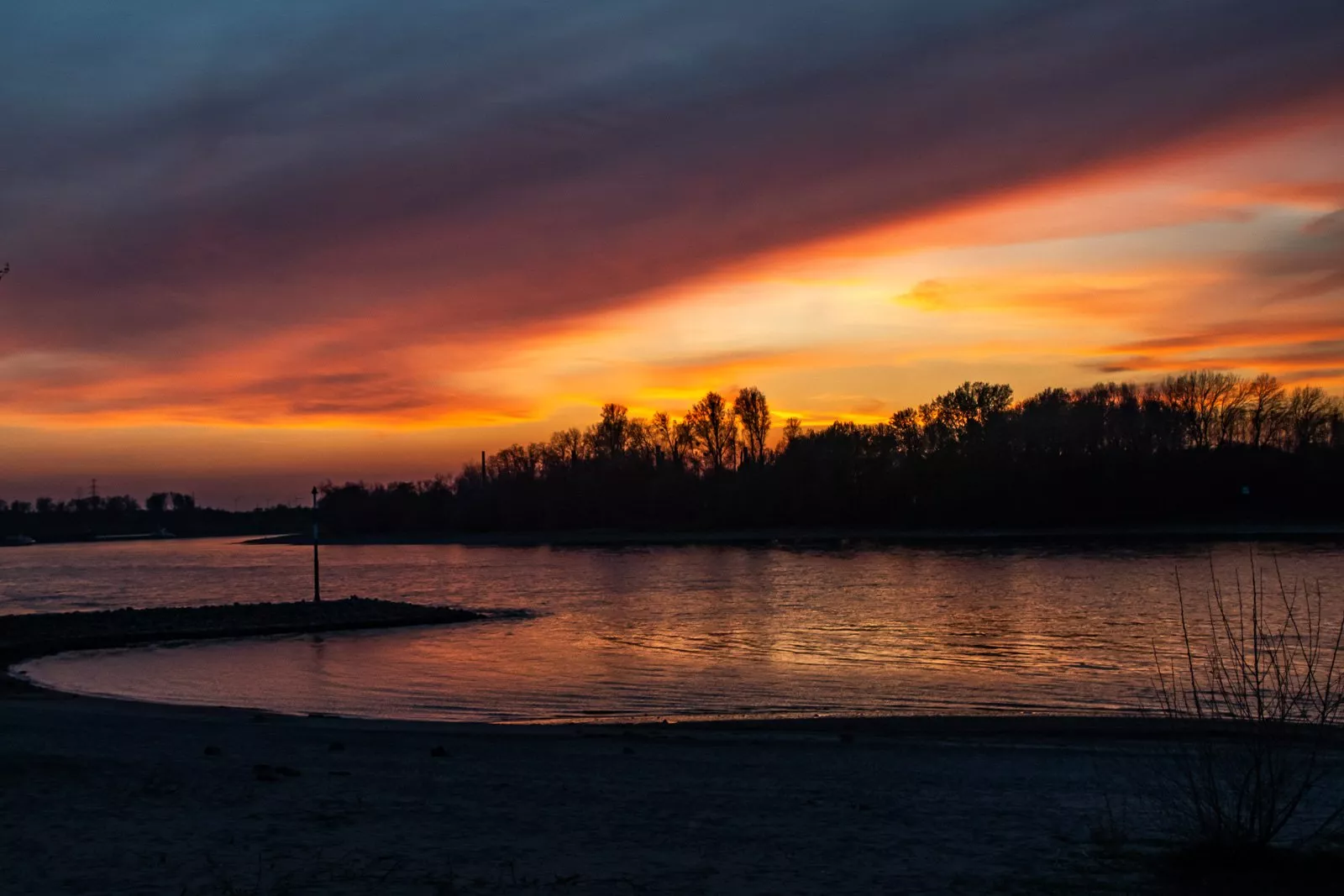 Camping Strandterrasse byl opravdu na pláži, měl slušné zázemí a veselého pana domácího. Především pak celé to místo bylo nečekaně pěkné, zejména večer. Když jsem si u stanu vařil jednu z těch japonských polívek a ochutnával ten banánový alkohol, postupně se nad Rýnem narýsoval neskutečný západ slunce a celé to dostalo nečekaně velkou dávku romantiky. Tedy nebýt otravných komárů a drzých slepic.