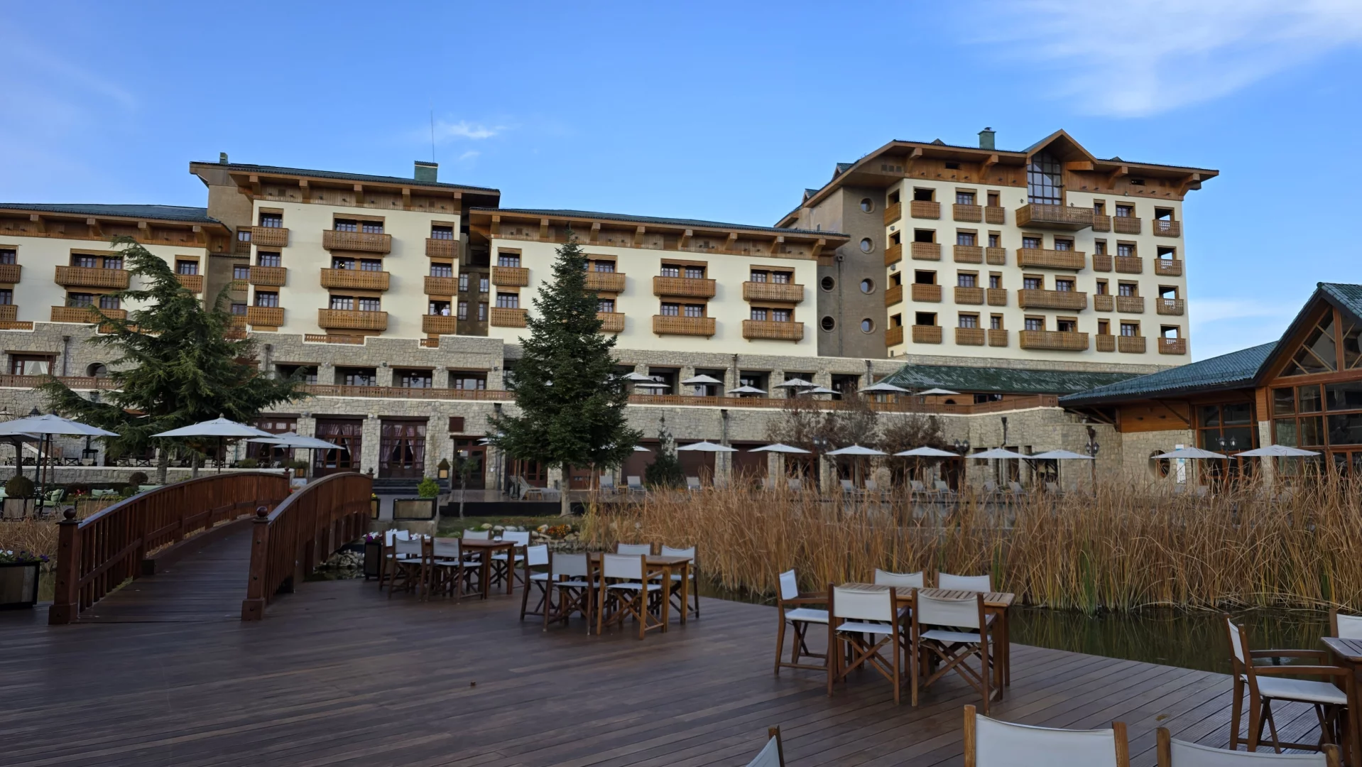Hranaté dřevěné balkony a šindelové střechy připomínají alpské resorty, což ale kontrastuje s interiérem, jemuž vévodí vysokánské stropy vykládané cedrovým dřevem, mozaikové zellige dlaždice a řemeslné koberce - zkrátka kombinace Alp a Orientu.
