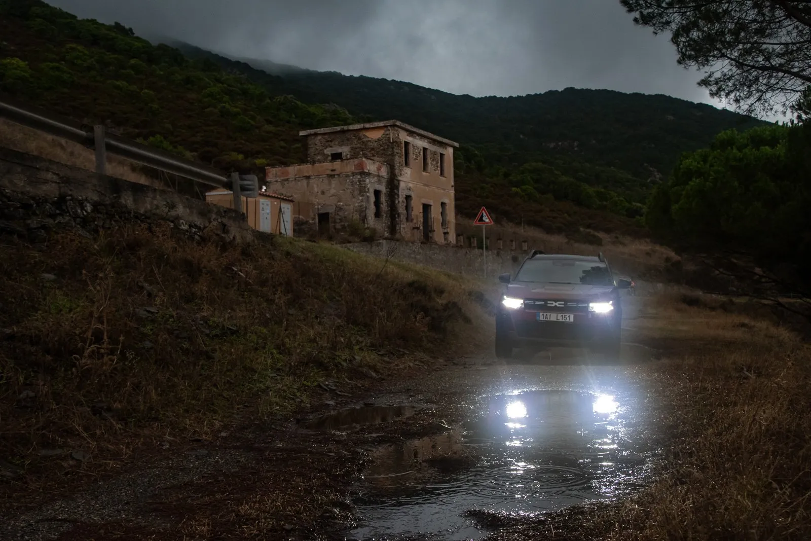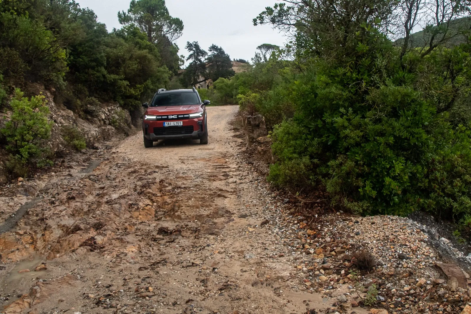 Přesně zde se dost hodila vysoká světlá výška (220 mm) naší Dacie a také fakt, že jsem tohle přejížděl směrem dolů. Jestli bych to zvládl v opačném směru jen s pohonem předních kol, to si nejsem jistý. Jakmile jsem to přejel, byl jsem si jist, že tudy už se asi nevrátím.