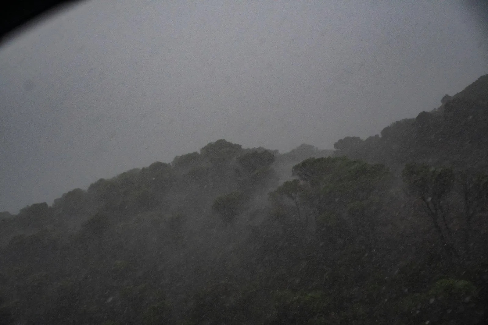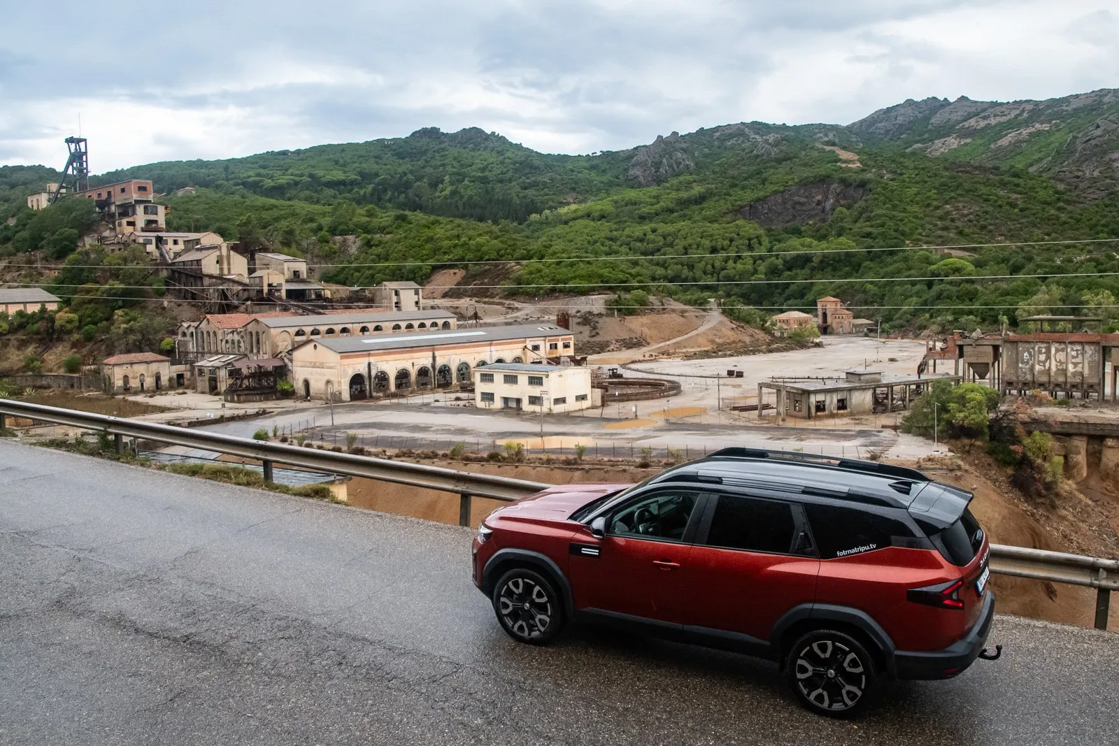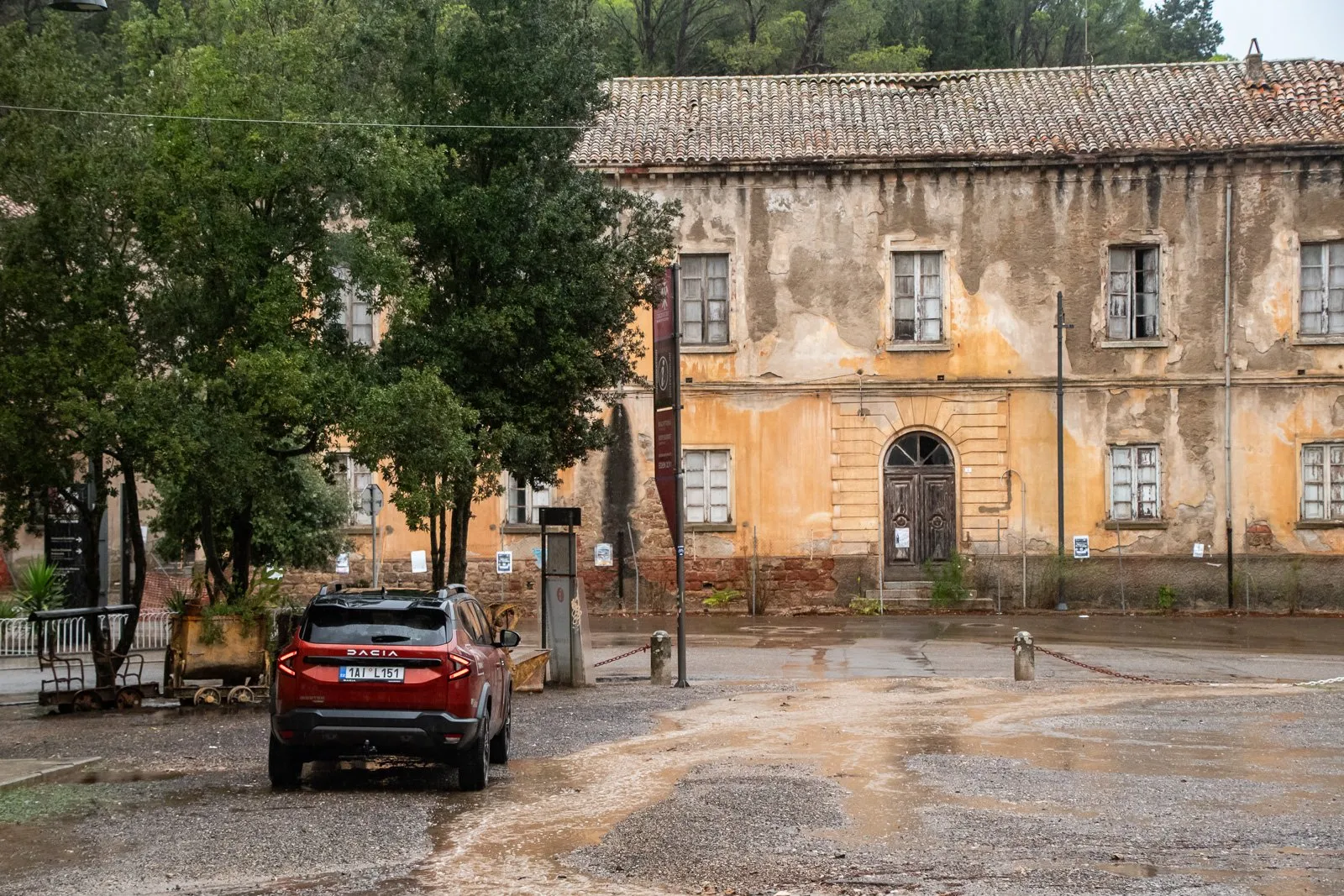 Ještě jsem stihnul zajet k nějaké bývalé hornické ubytovně, ale když jsem vylezl ven, začalo poprchávat a během chvíle přišel totální liják. Lépe to pro apokalyptické fotky asi vyjít nemohlo. Během chvíle se na silnicích objevily potoky vody, které vyplavily bláto, kameny a větve. Nakonec jsem snahu sjet k dolu v dešti vzdal a raději počkal na plácku u silnice, až to přejde. Viditelnost byla nulová. To nám to pěkně začíná...