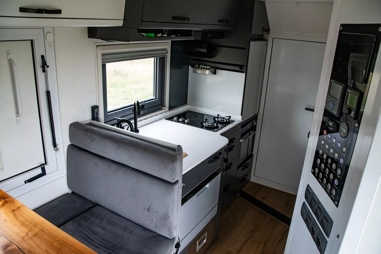 Vzadu je obrovská postel (má 2 x 1,6 m), které je ventilovaná a vyhřívaná. Na další lůžko se dá předělat sezení uprostřed auta a za kabinou je kuchyň obsahující třeba i myčku. Naproti je prostorná koupelna s klasickým záchodem. Nábytek je opravdu pěkný, všude spousta skříněk, LED osvětlení, nechybí lednice, 90l mrazák, plynový a indukční sporák, diodové osvětlení a tak podobně. Všechno se ovládá přes rozměrný ovládací panel opatřený řadou čudlíků a několika displeji. Tady se zkrátka co do komfortu bydlení mnoho kompromisů nedělá.