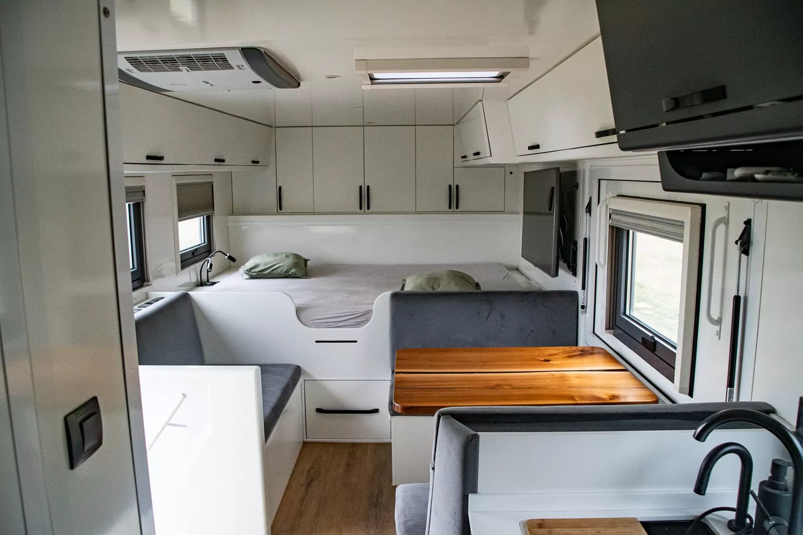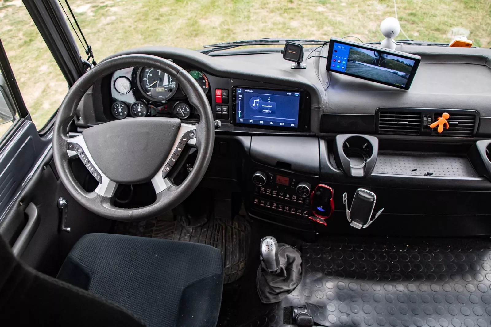 Nástavba je vyrobená ze sendvičových panelů z laminátového kompozitu, přičemž stěny mají necelých 8 cm. Kromě bočních vstupních dveří tu jsou také malé dveře umožňující přímý přístup do kabiny řidiče. Když vlezete dovnitř, zaujme zpracování nábytku ostře kontrastující s tím, co byste si možná v kontextu skoro třicetiletého náklaďáku představili.