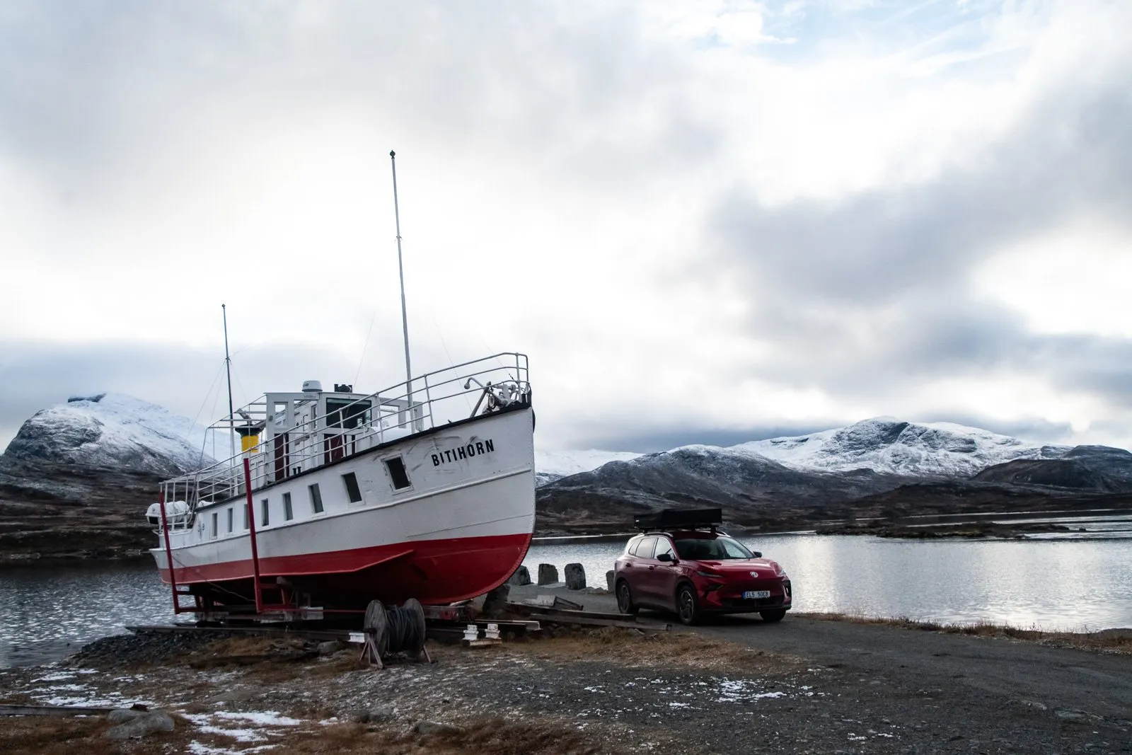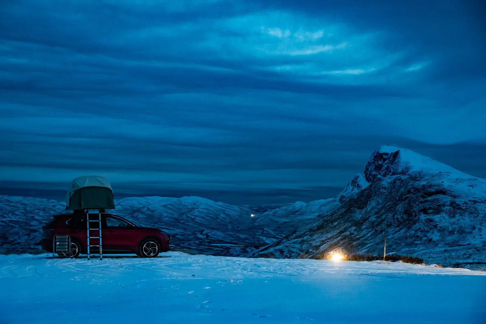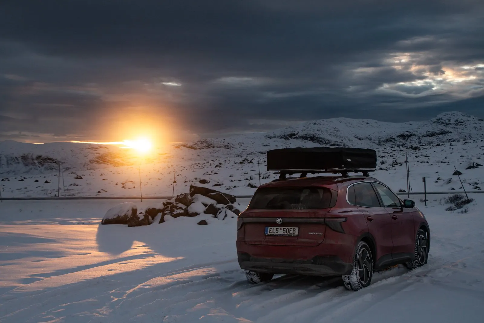 Na tuhle cestu jsme vyrazili elektrickým MGS5 EV, které dostalo na střechu stan od Thule. Norsko je zemí elektromobilům zaslíbenou a hlavně tohle auto lze používat jako velkou powerbanku. Jeho baterka tak sloužila jako zdroj pro elektrické topení ve stanu. Proto se dalo kempovat i v takové zimě celkem bez potíží.